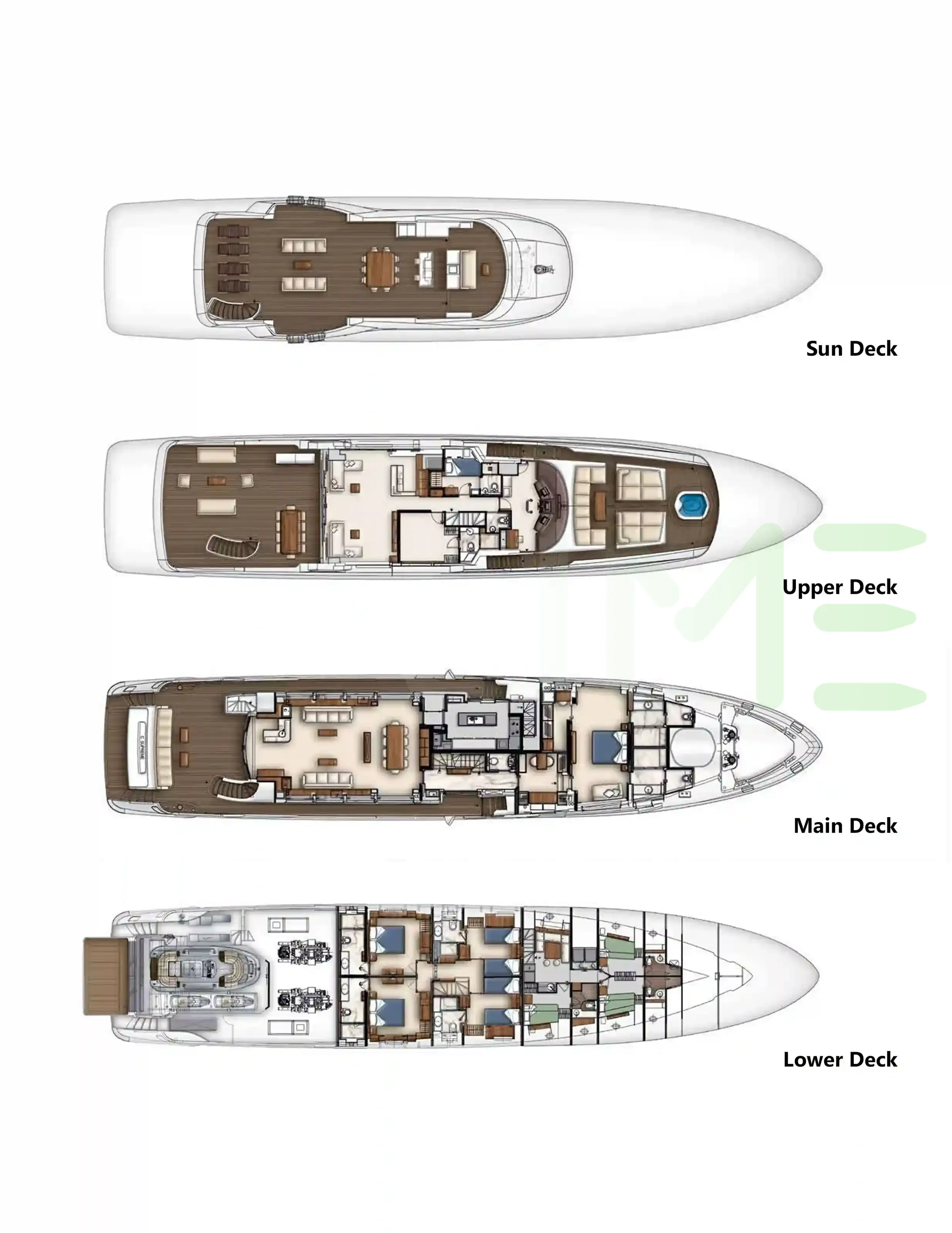 Request plans that include the layout of staterooms, guest areas, and outdoor spaces, as well as crew quarters and work areas.