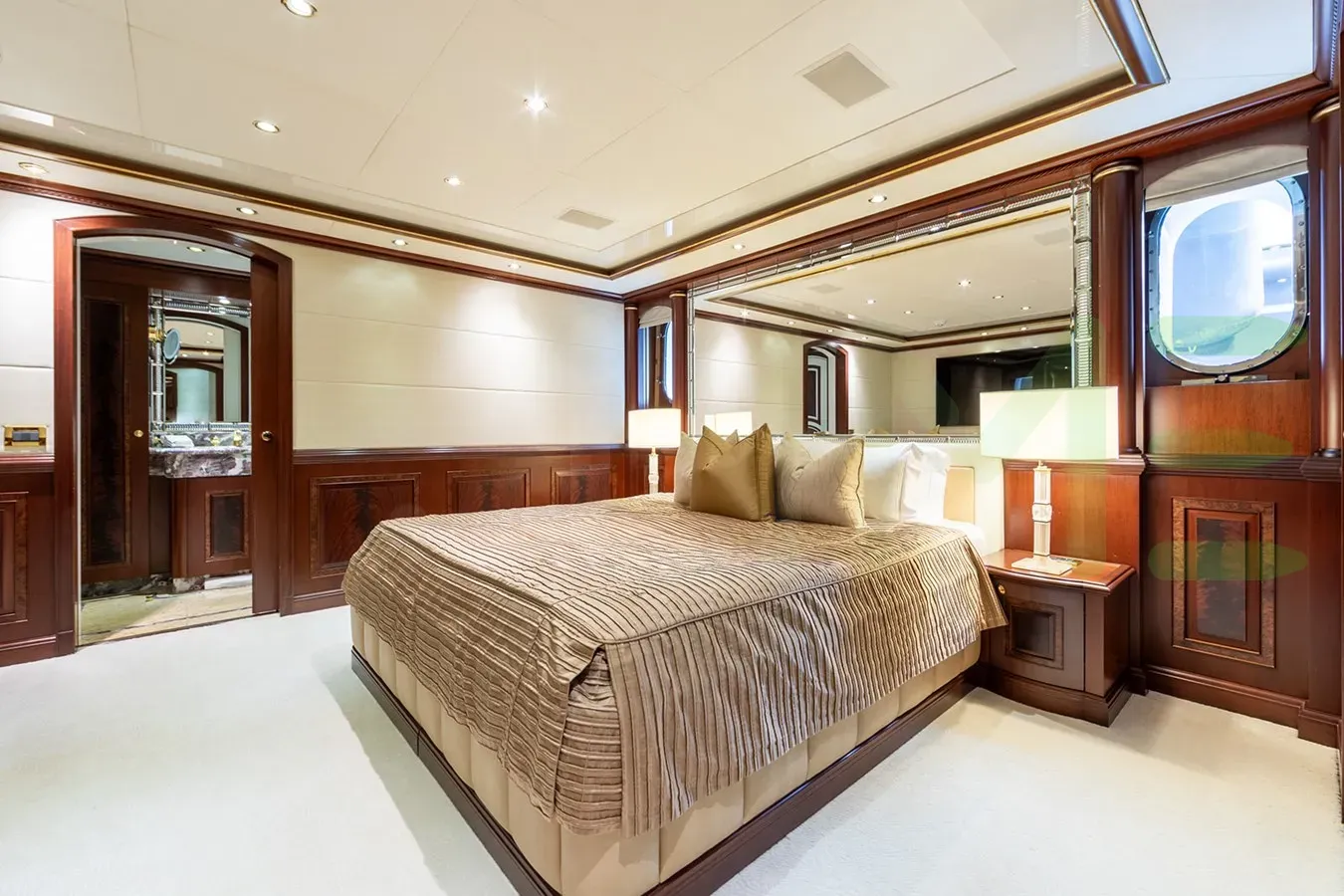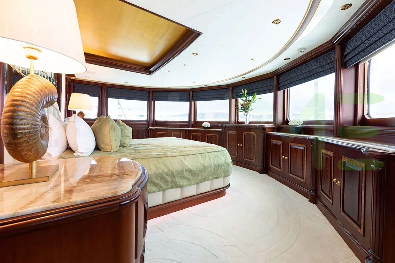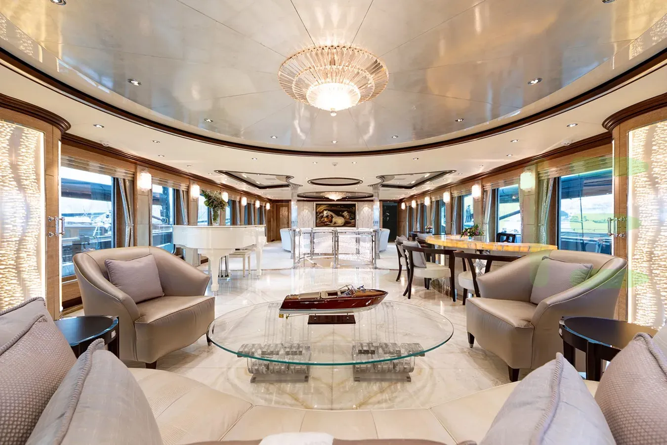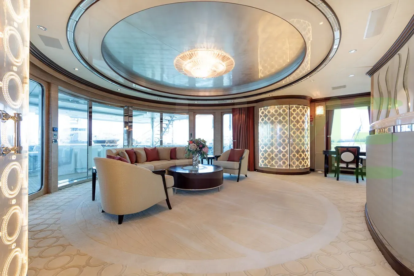 With a gross tonnage of 1,150, the QUEEN MAVIA yacht for charter provides ample interior space for enjoyment. QUEEN MAVIA offers accommodations for up to 10 guests in 6 lavishly appointed staterooms. She can also carry up to 13 crew onboard, including the Captain, to ensure a relaxed luxury yacht charter experience. The interior design by Evan K Marshall, The A Group exudes a sense of luxury, seamlessly blending comfort with style.