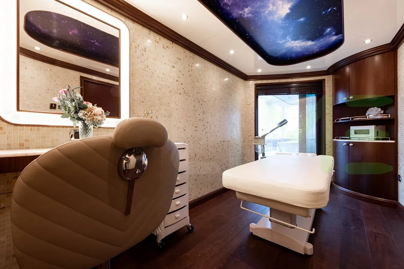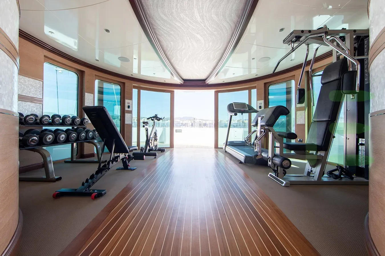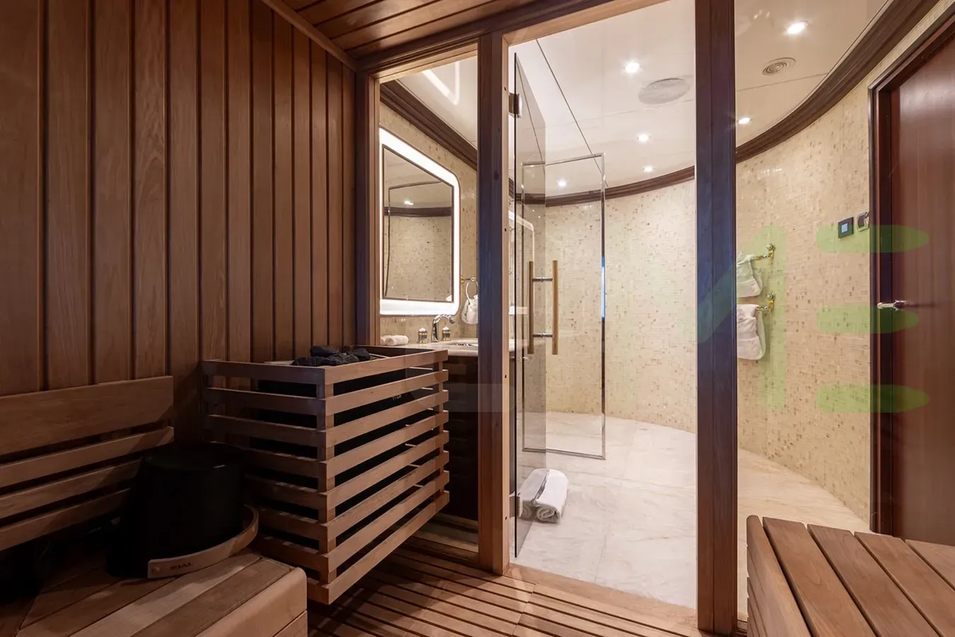 Her features include a spa, sauna, beach club, gym, deck jacuzzi, WiFi and air conditioning.
