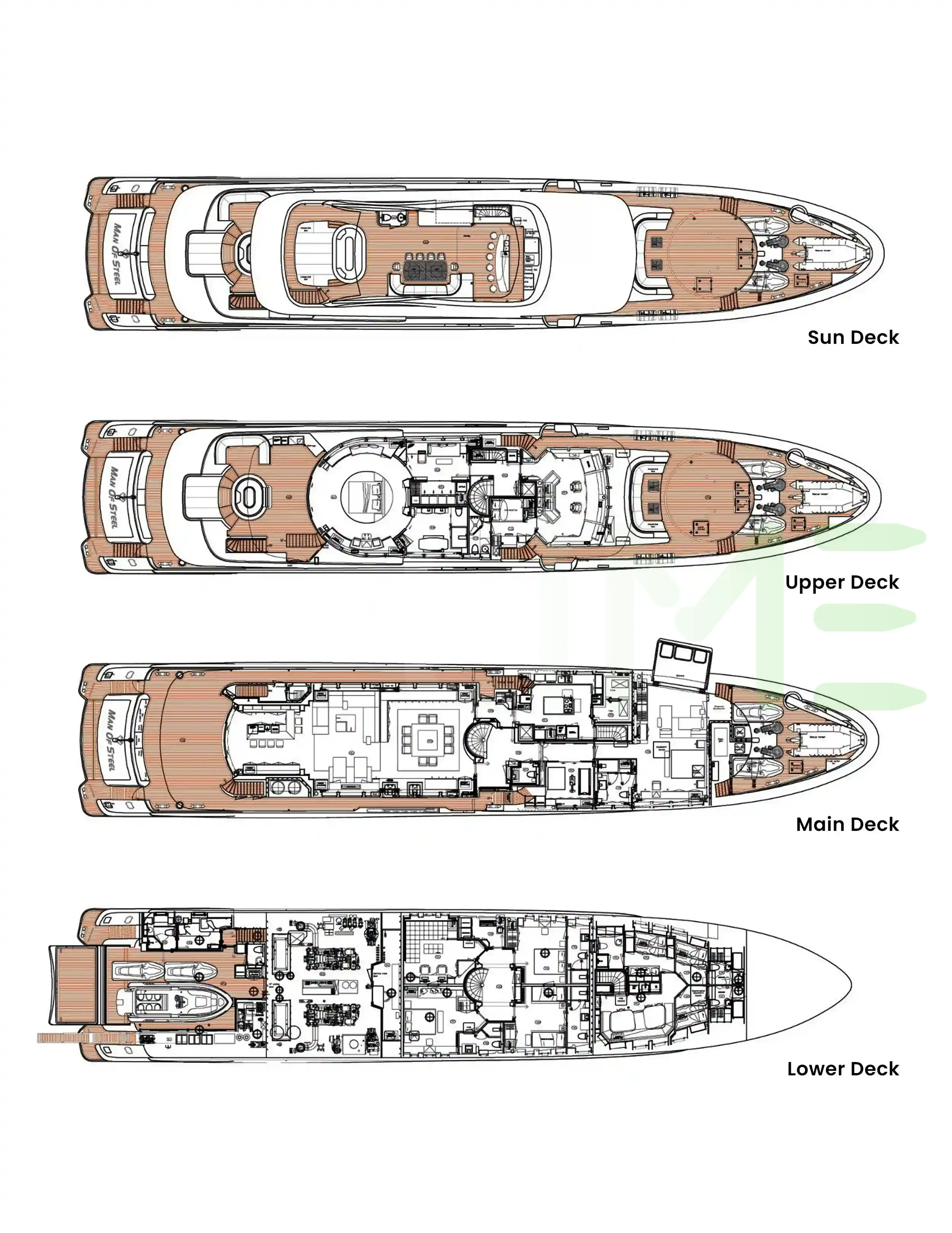 Request plans that include the layout of staterooms, guest areas, and outdoor spaces, as well as crew quarters and work areas.