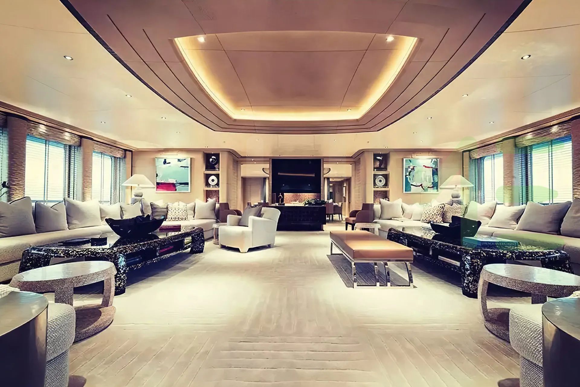 Her features include a movie theatre, beauty salon, elevator, beach club, gym and air conditioning.