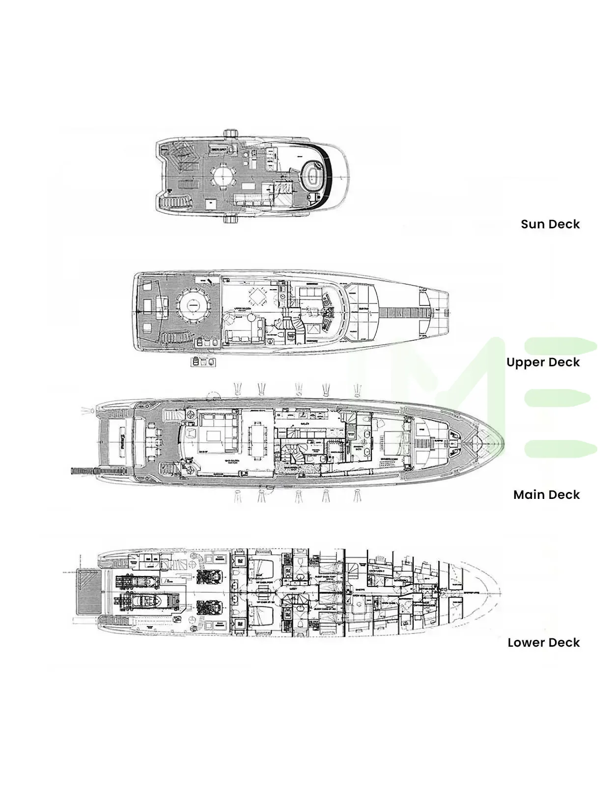 Request plans that include the layout of staterooms, guest areas, and outdoor spaces, as well as crew quarters and work areas.