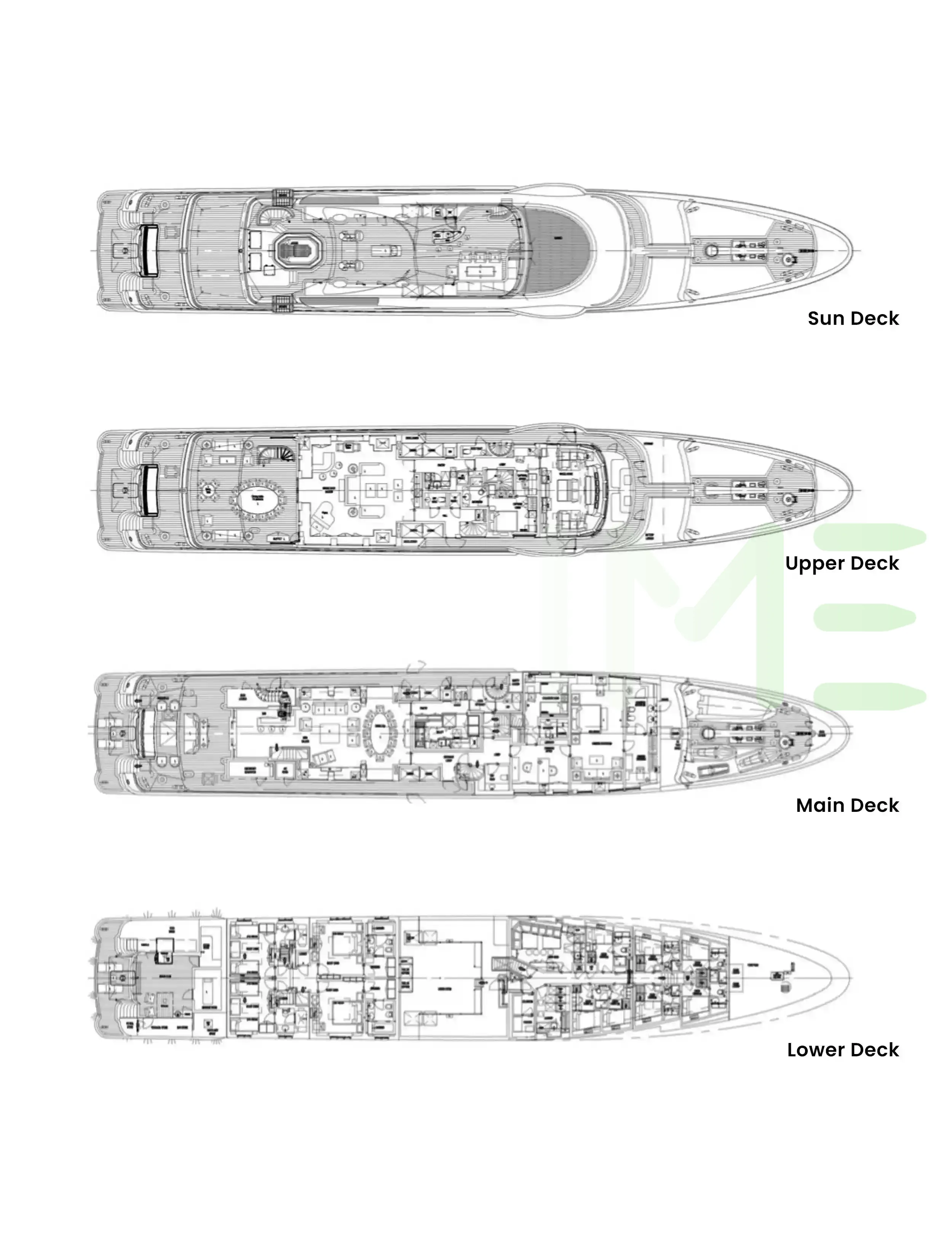 Request plans that include the layout of staterooms, guest areas, and outdoor spaces, as well as crew quarters and work areas.