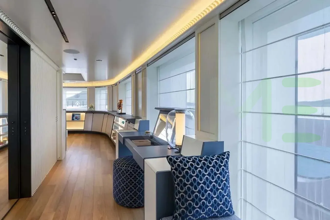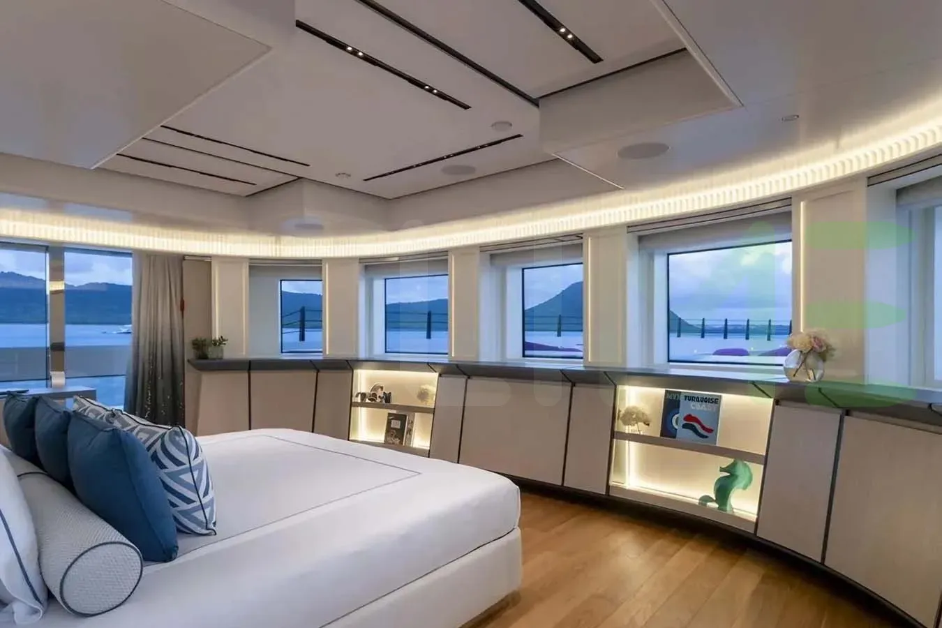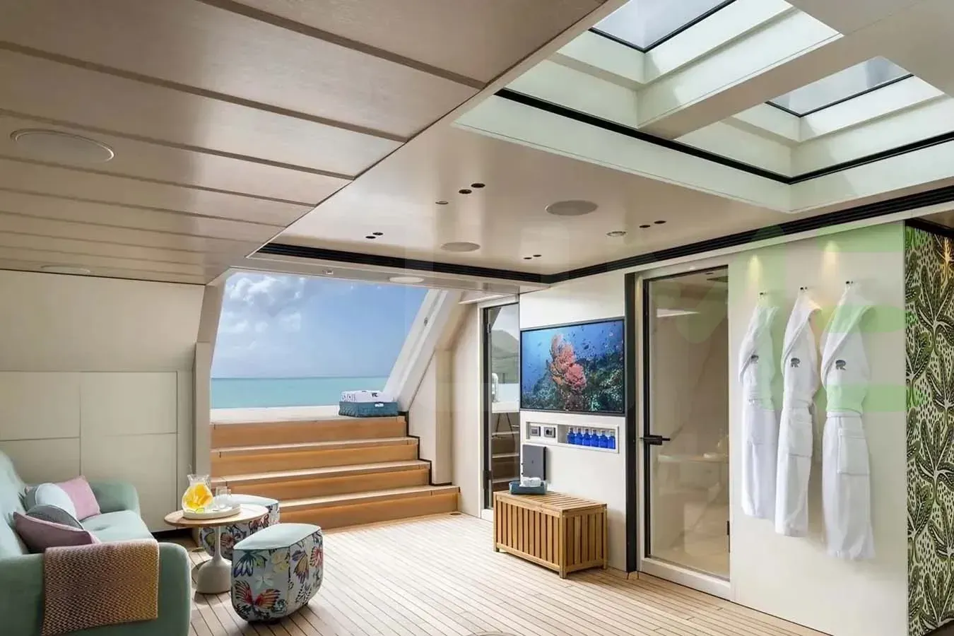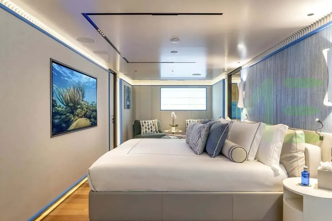 With a gross tonnage of 1,218, the RIO yacht for charter provides ample interior space for enjoyment. RIO offers accommodations for up to 12 guests in 6 lavishly appointed staterooms. She can also carry up to 15 crew onboard, including the Captain, to ensure a relaxed luxury yacht charter experience. The interior design by Pulina Exclusive Interiors exudes a sense of luxury, seamlessly blending comfort with style.