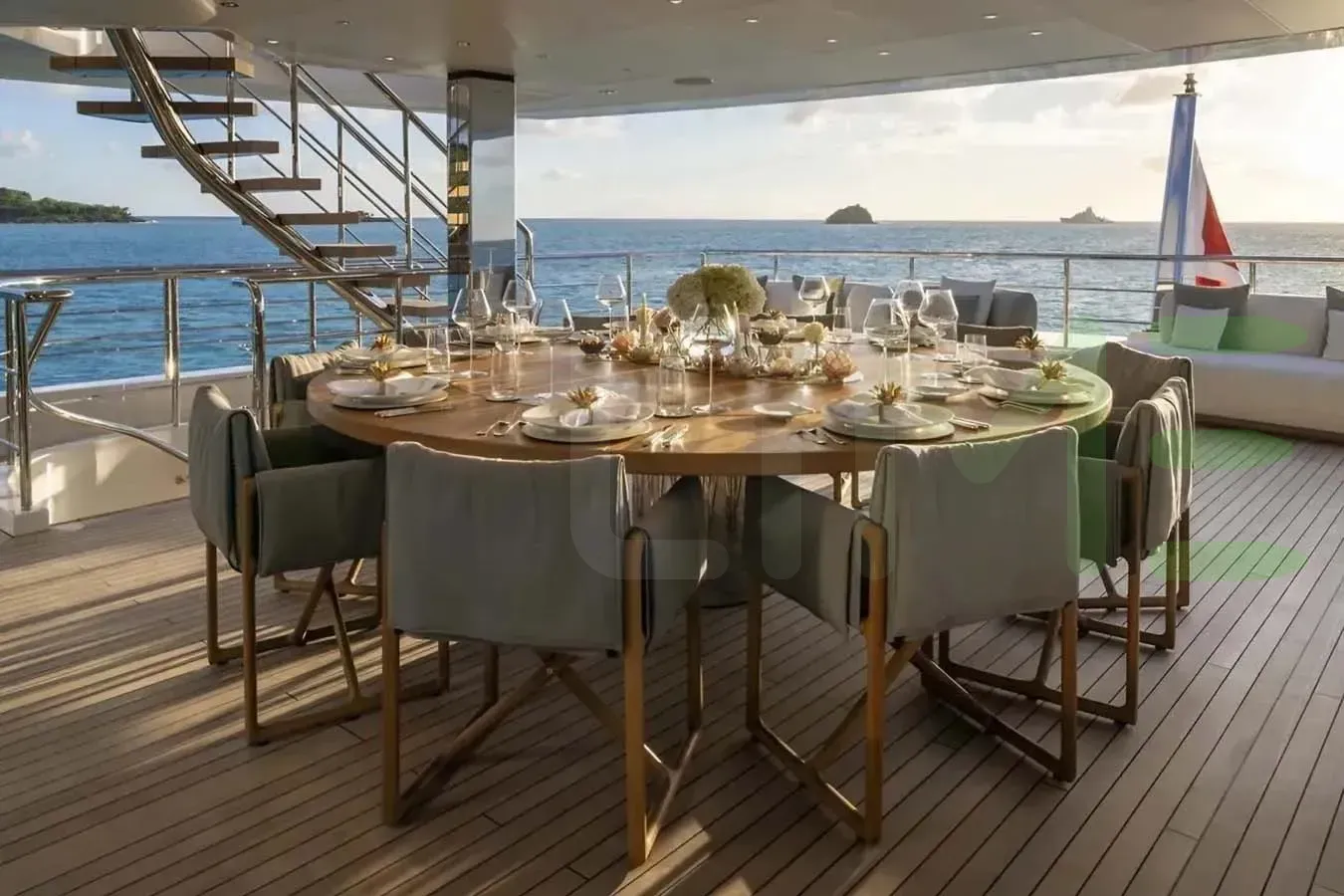 The exterior, designed by Omega Architects, captures your attention with beautiful lines and impeccable craftsmanship. Whether you're lounging on the spacious decks or enjoying water sports in a secluded anchorage, the RIO yacht for charter, built of Steel and Aluminium, offers a wealth of opportunities for relaxation and adventure.