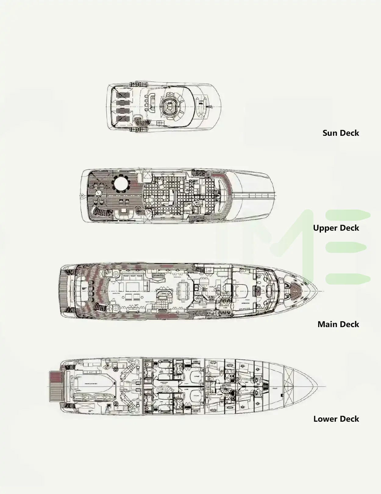 Request plans that include the layout of staterooms, guest areas, and outdoor spaces, as well as crew quarters and work areas.