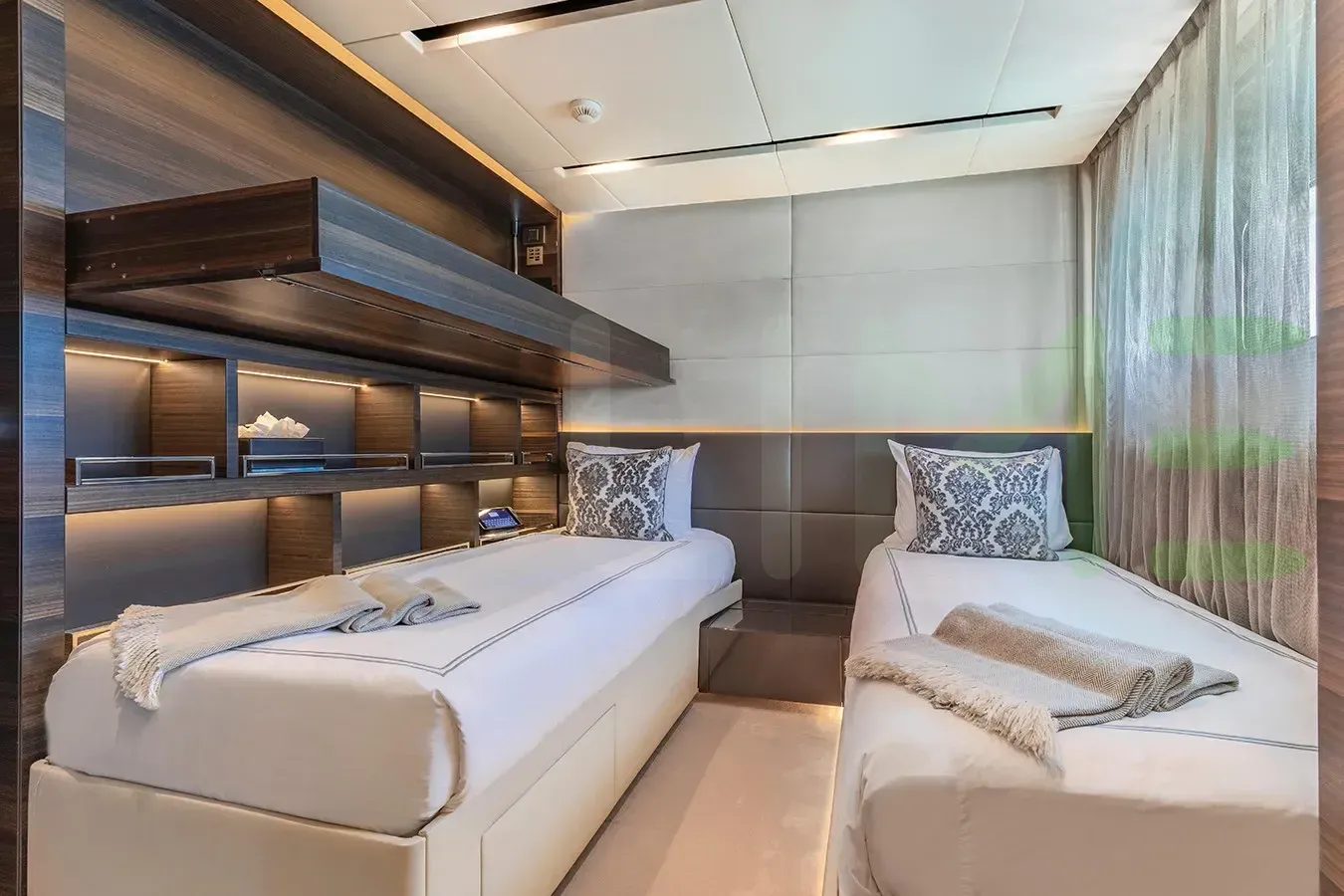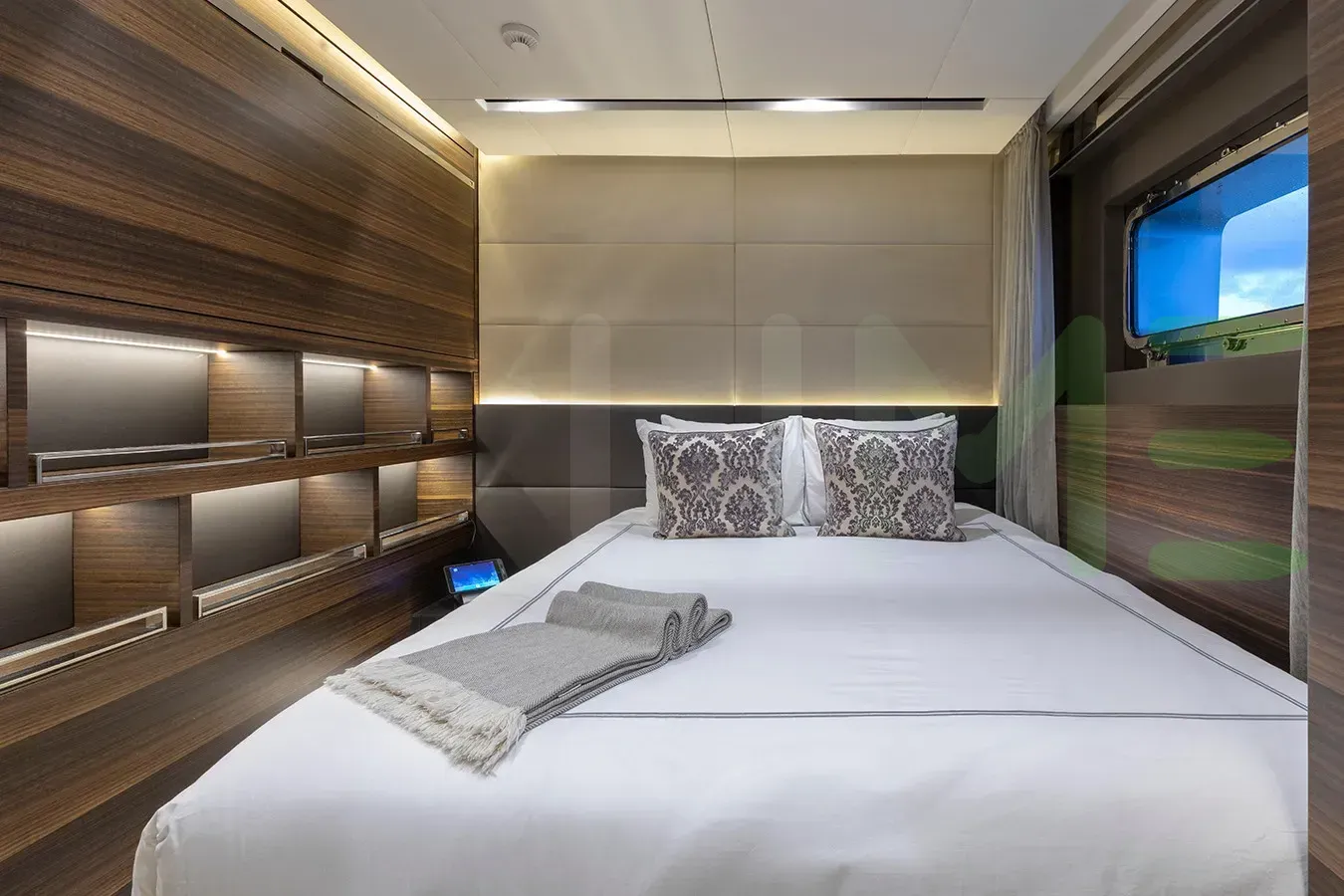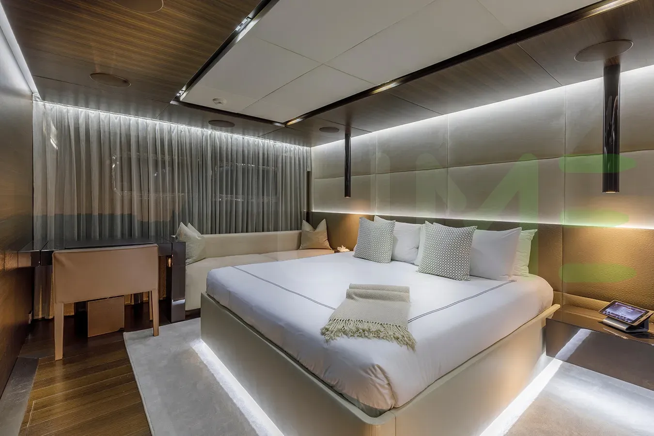 With a gross tonnage of 284, the SAFE HAVEN yacht for charter provides ample interior space for enjoyment. SAFE HAVEN offers accommodations for up to 11 guests in 5 lavishly appointed staterooms. She can also carry up to 6 crew onboard, including the Captain, to ensure a relaxed luxury yacht charter experience. The interior design by Admiral exudes a sense of luxury, seamlessly blending comfort with style.
