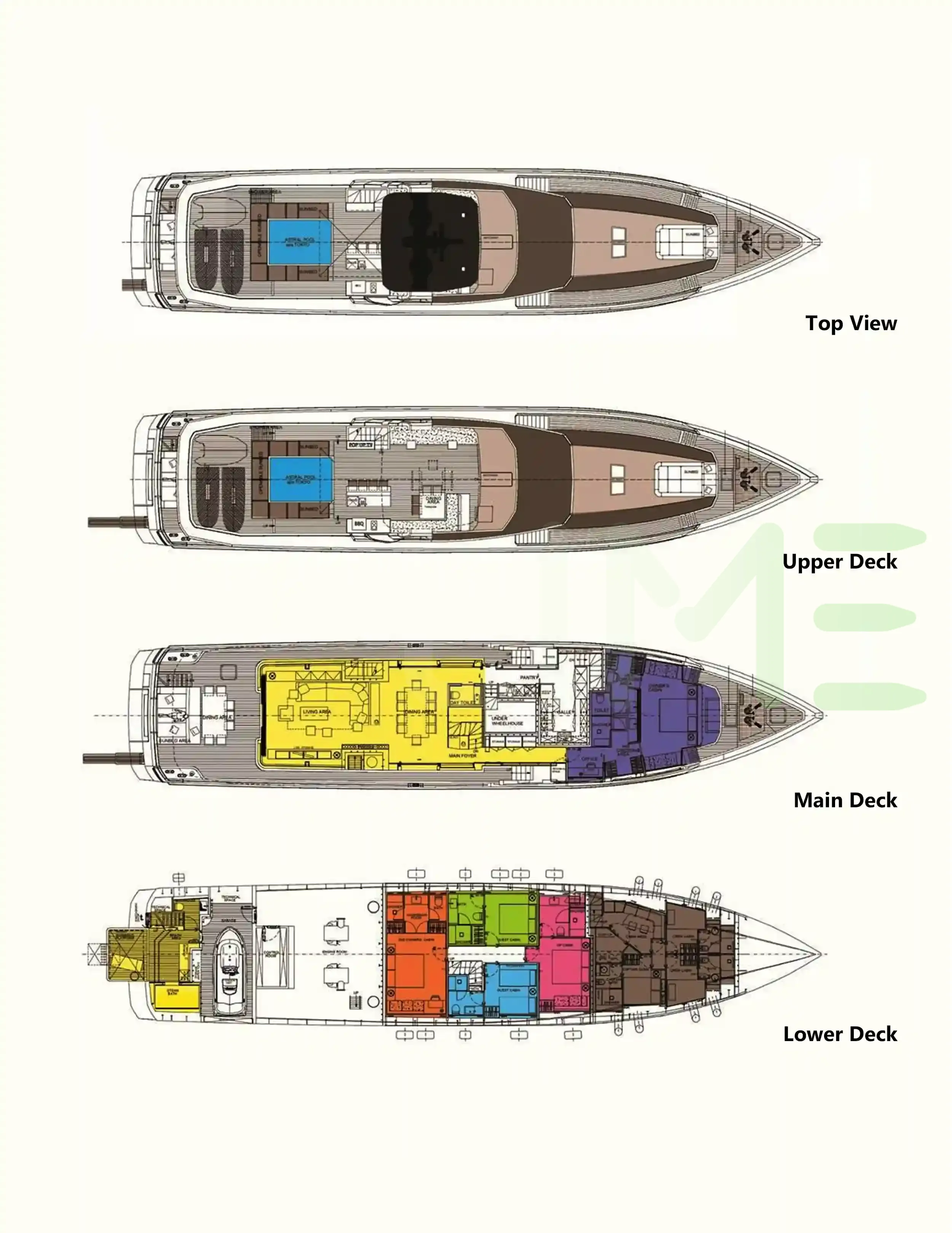 Request plans that include the layout of staterooms, guest areas, and outdoor spaces, as well as crew quarters and work areas.