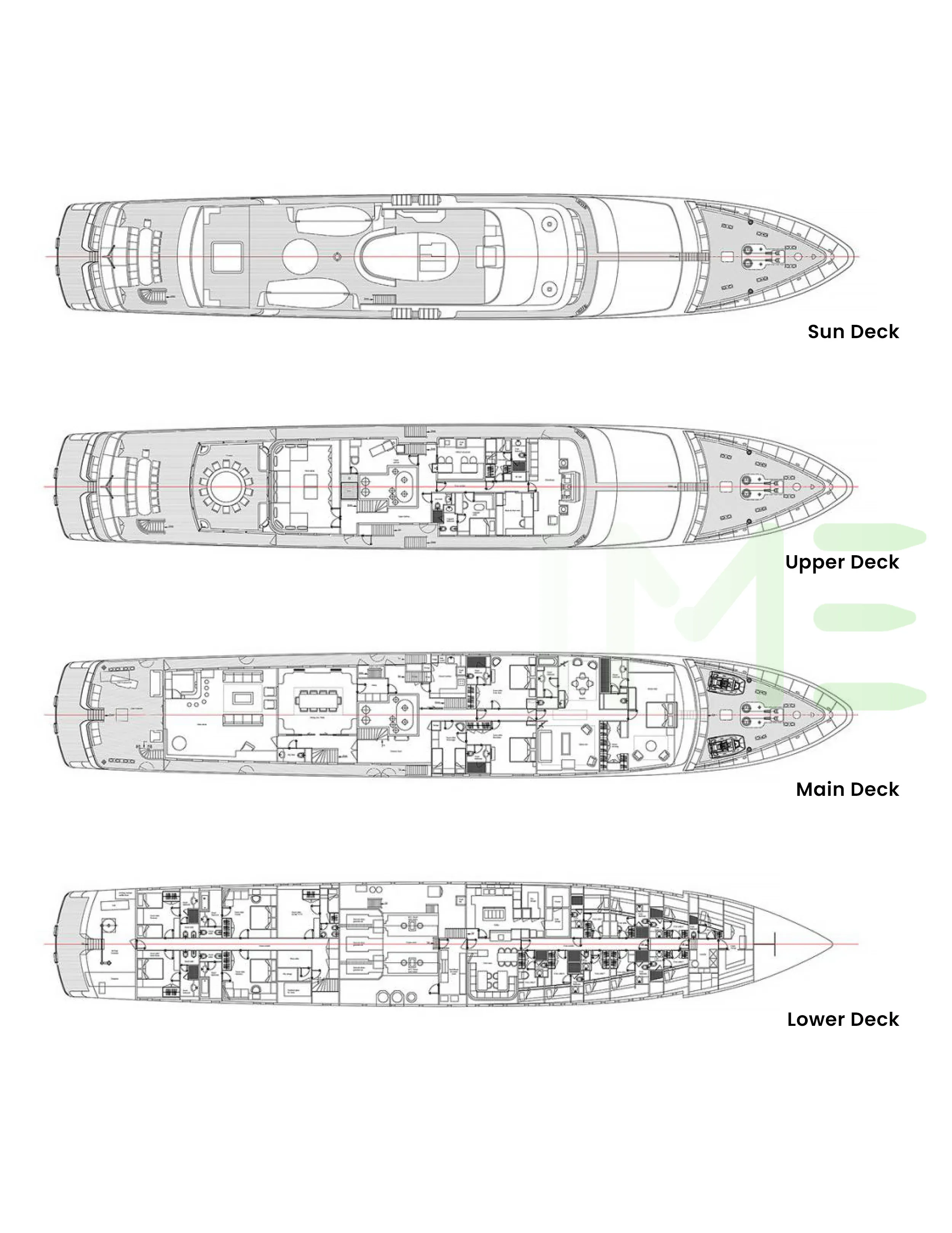 Request plans that include the layout of staterooms, guest areas, and outdoor spaces, as well as crew quarters and work areas.