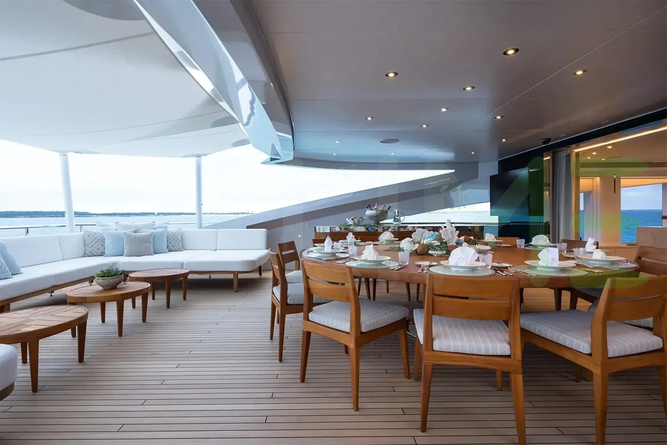 The exterior, designed by Omega Architects, captures your attention with beautiful lines and impeccable craftsmanship. Whether you're lounging on the spacious decks or enjoying water sports in a secluded anchorage, the SANTOSHA yacht for charter, built of Aluminium, offers a wealth of opportunities for relaxation and adventure.