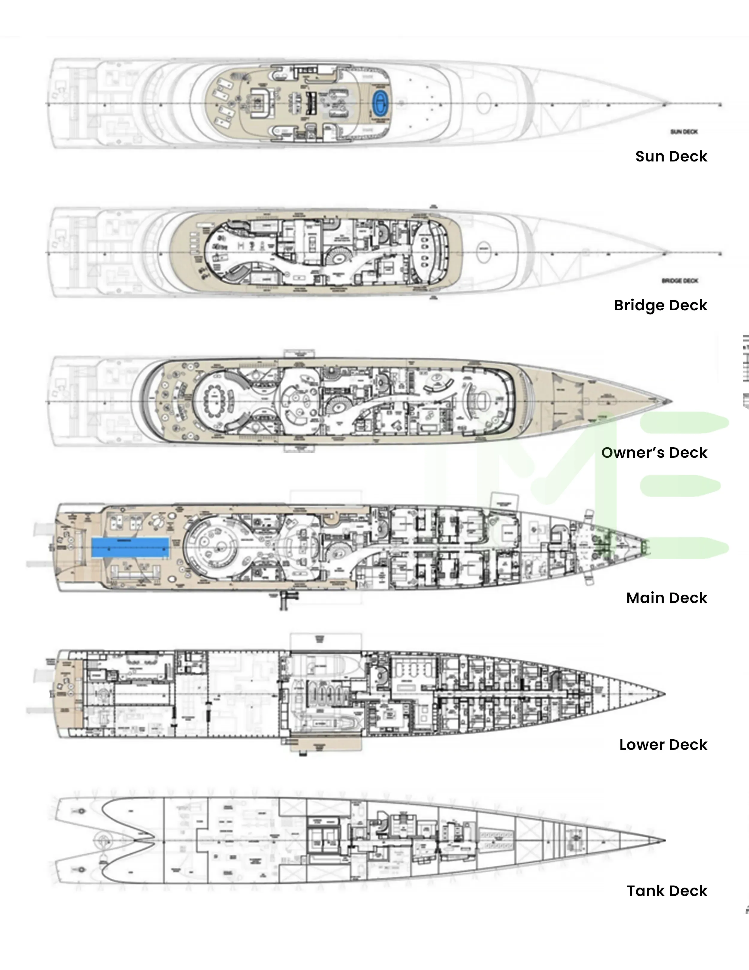 Request plans that include the layout of staterooms, guest areas, and outdoor spaces, as well as crew quarters and work areas.