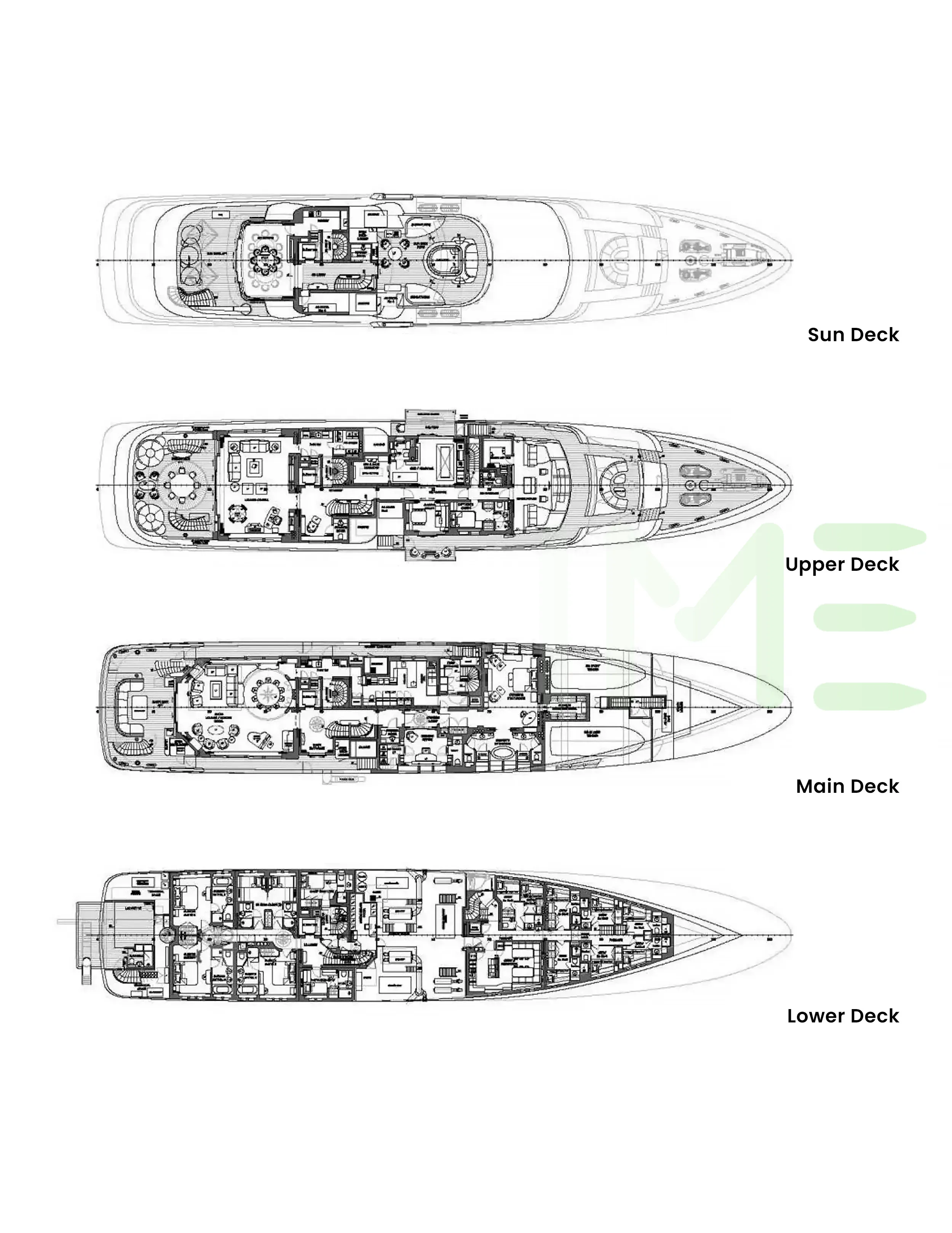 Request plans that include the layout of staterooms, guest areas, and outdoor spaces, as well as crew quarters and work areas.