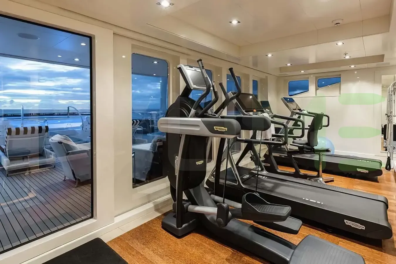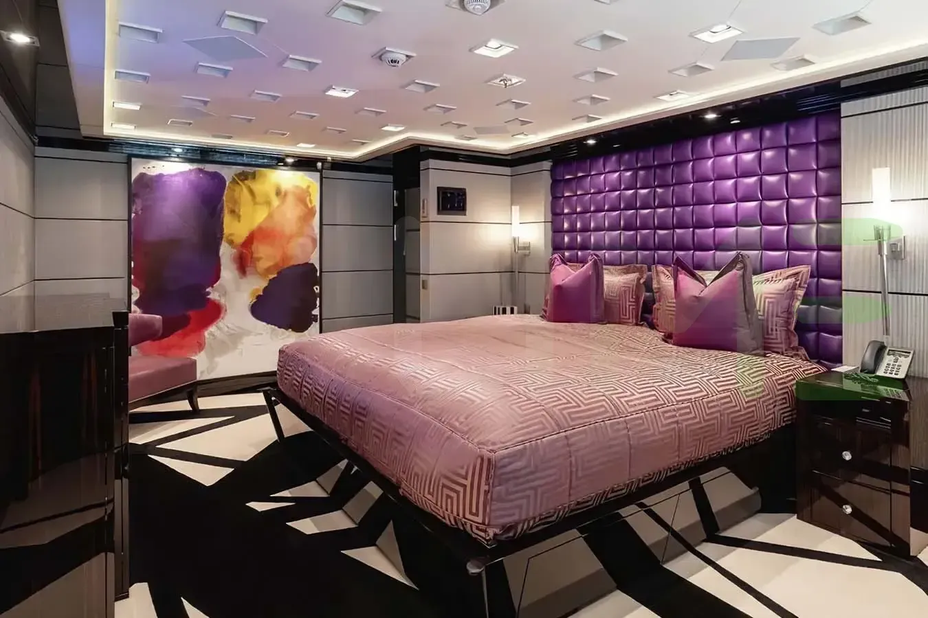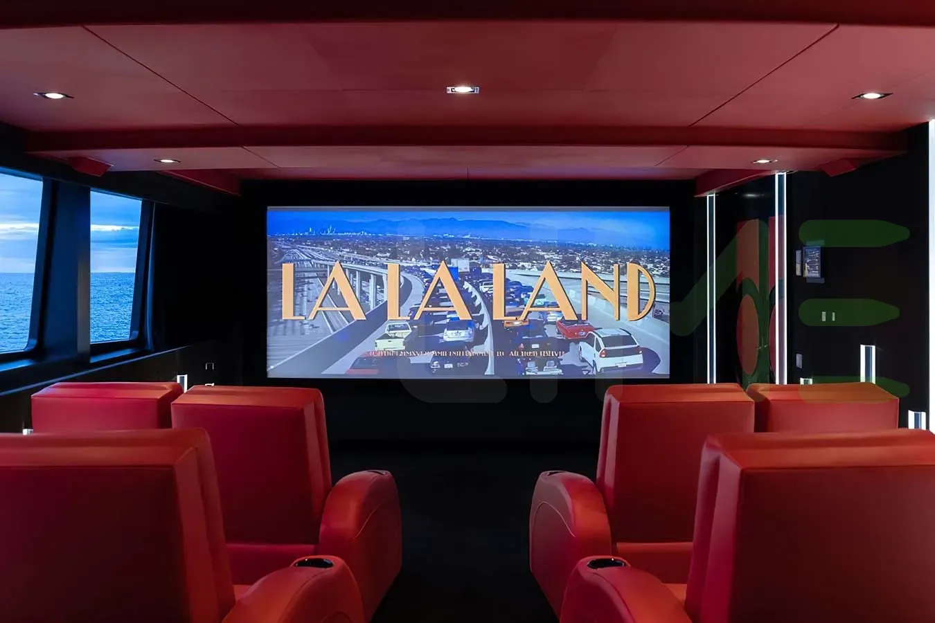 Her features include a movie theatre, elevator, underwater lights, gym and air conditioning.
