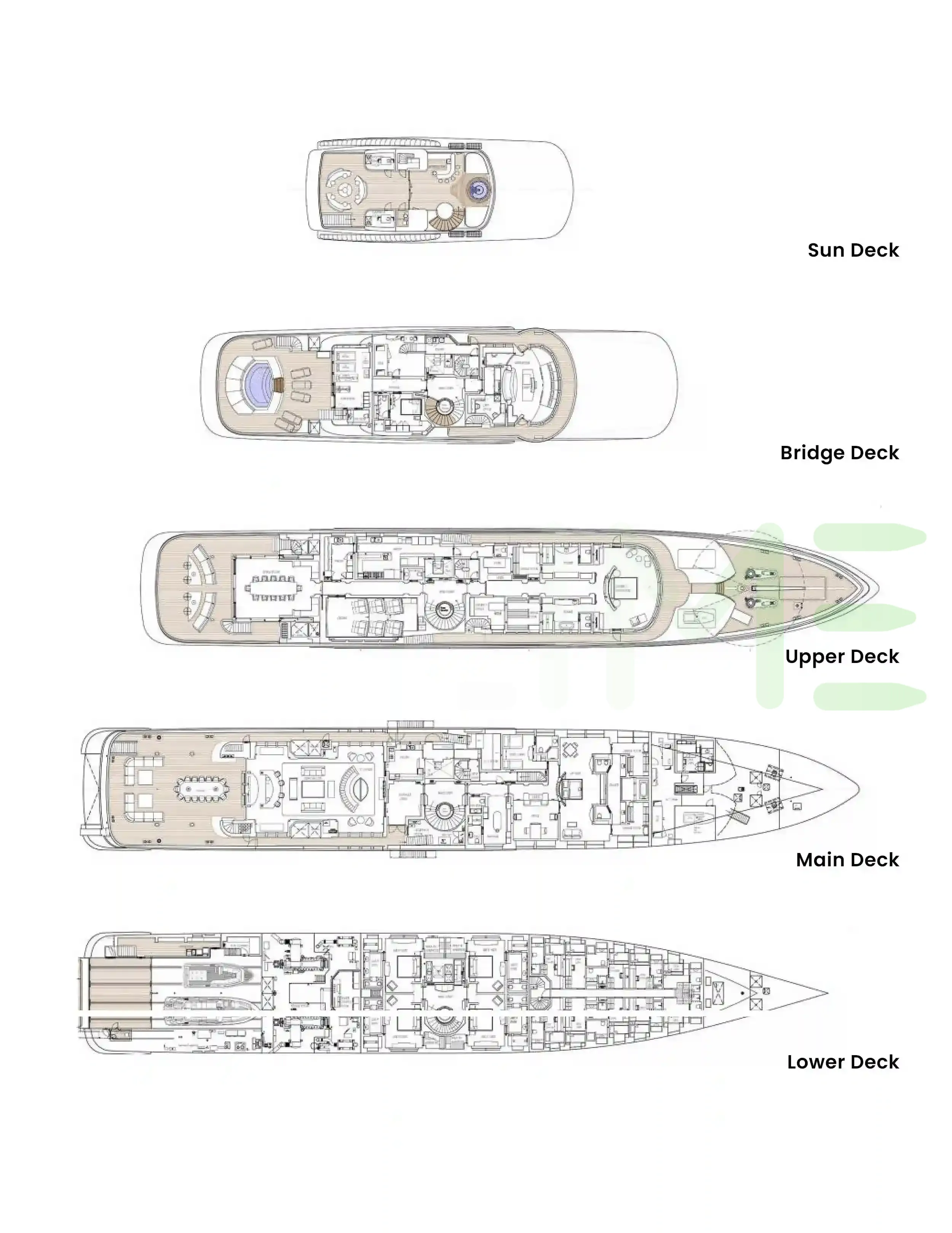 Request plans that include the layout of staterooms, guest areas, and outdoor spaces, as well as crew quarters and work areas.