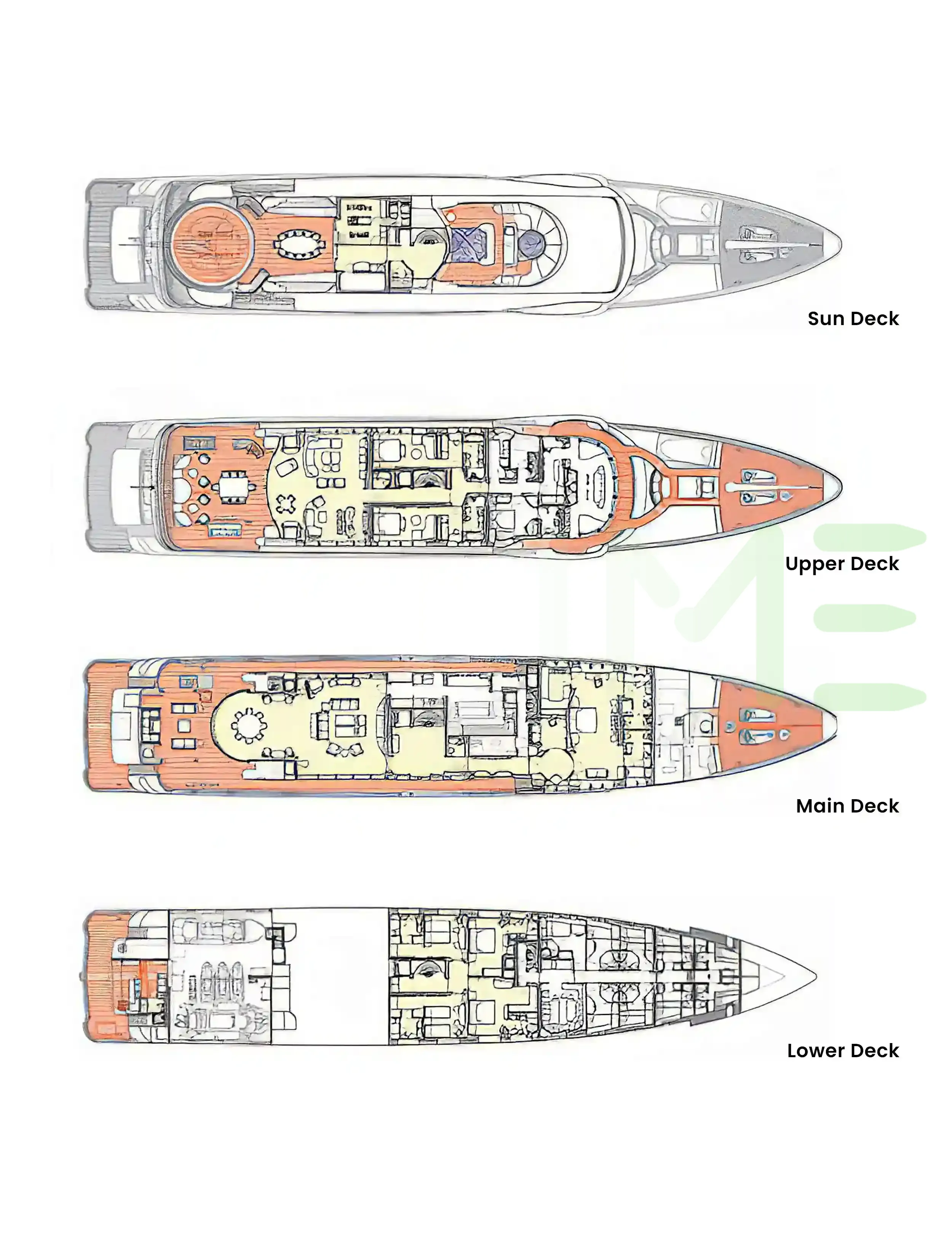Request plans that include the layout of staterooms, guest areas, and outdoor spaces, as well as crew quarters and work areas.
