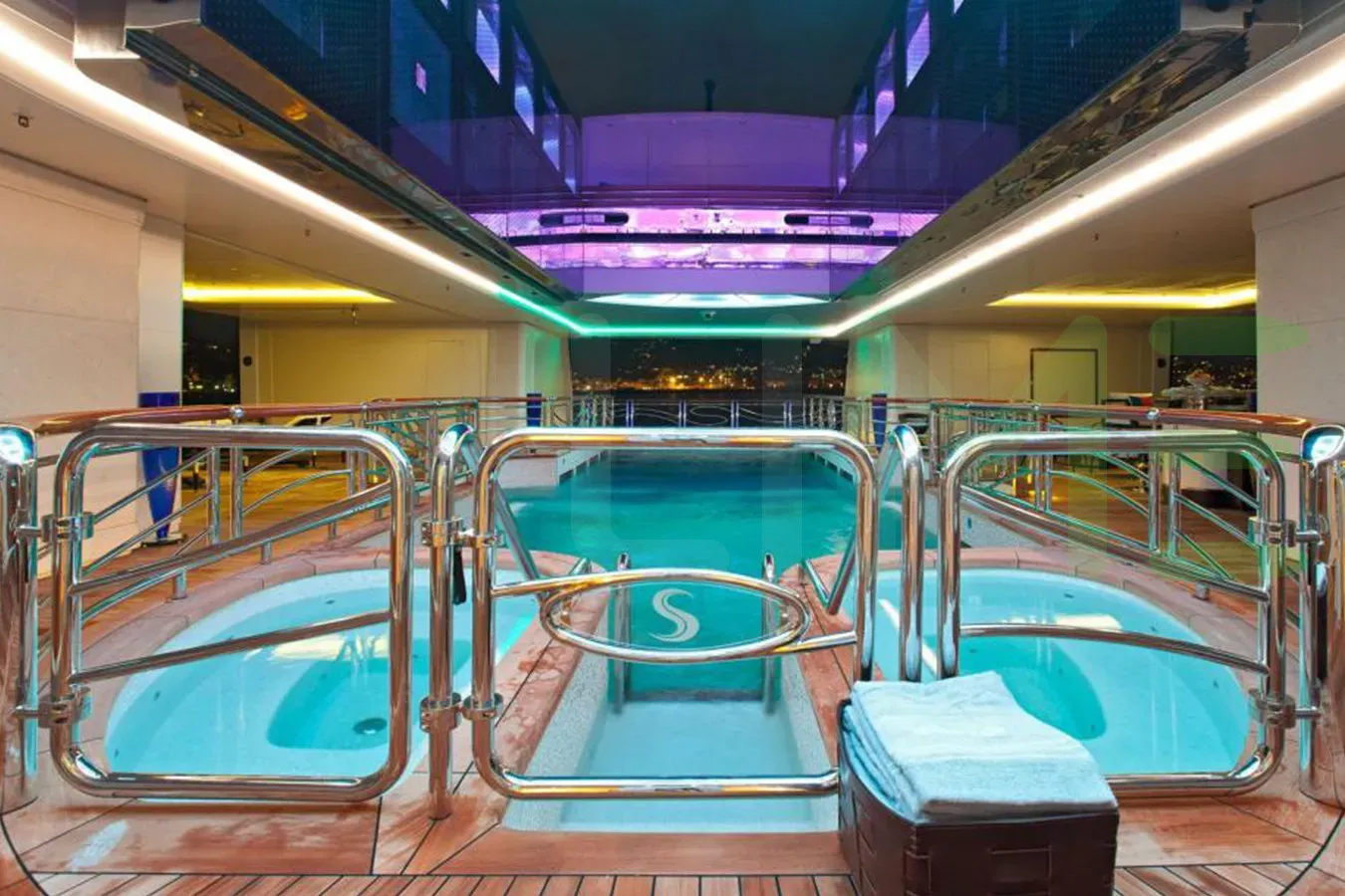 Her features include a dancefloor, wheelchair accessibility, spa, beauty salon, satellite communications, beach club, gym, deck jacuzzi, WiFi and air conditioning.