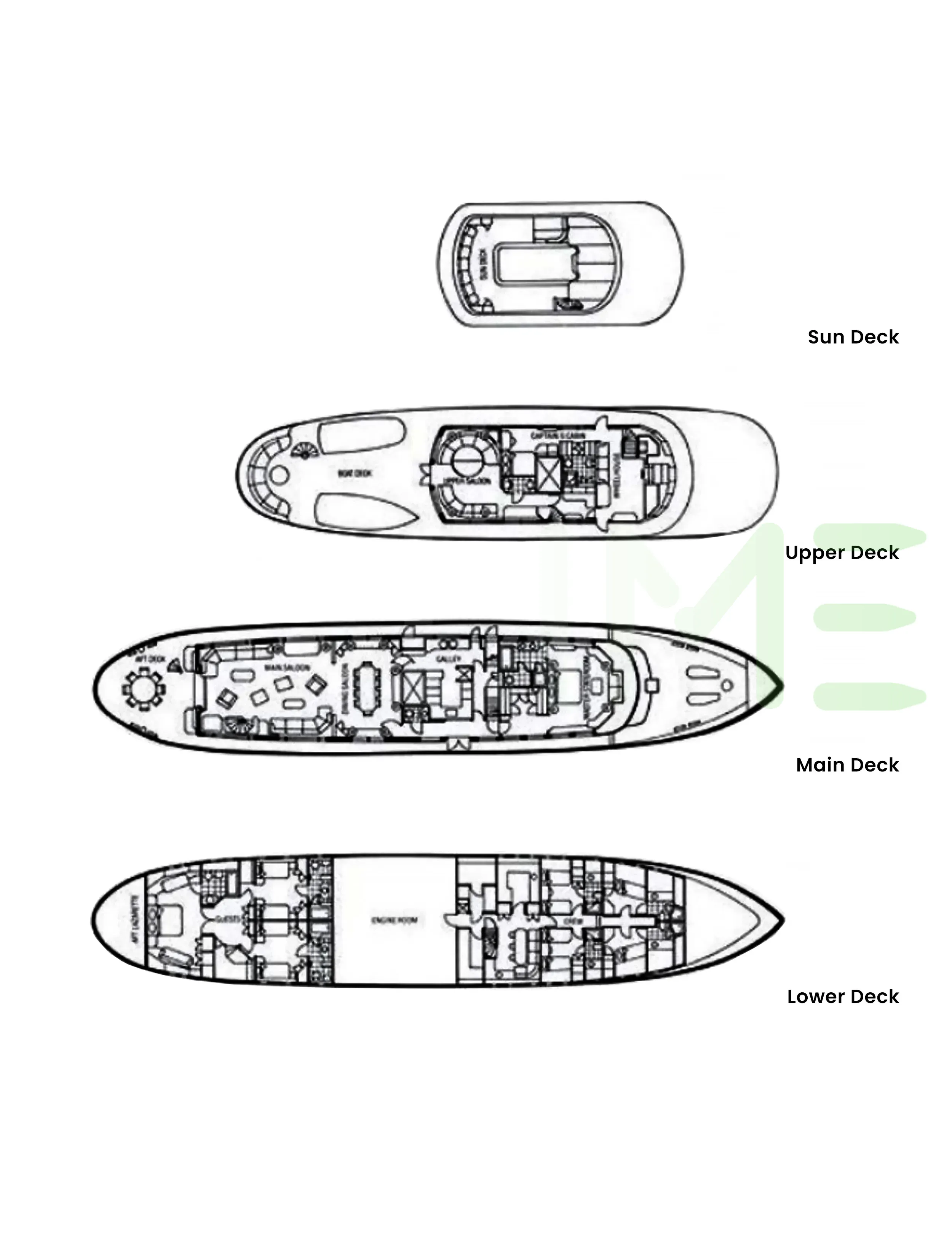 Request plans that include the layout of staterooms, guest areas, and outdoor spaces, as well as crew quarters and work areas.