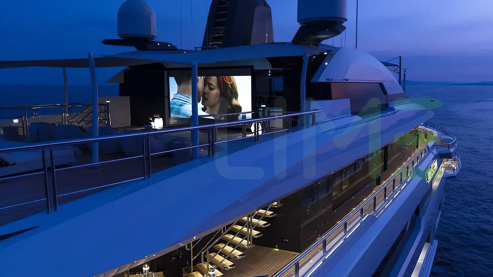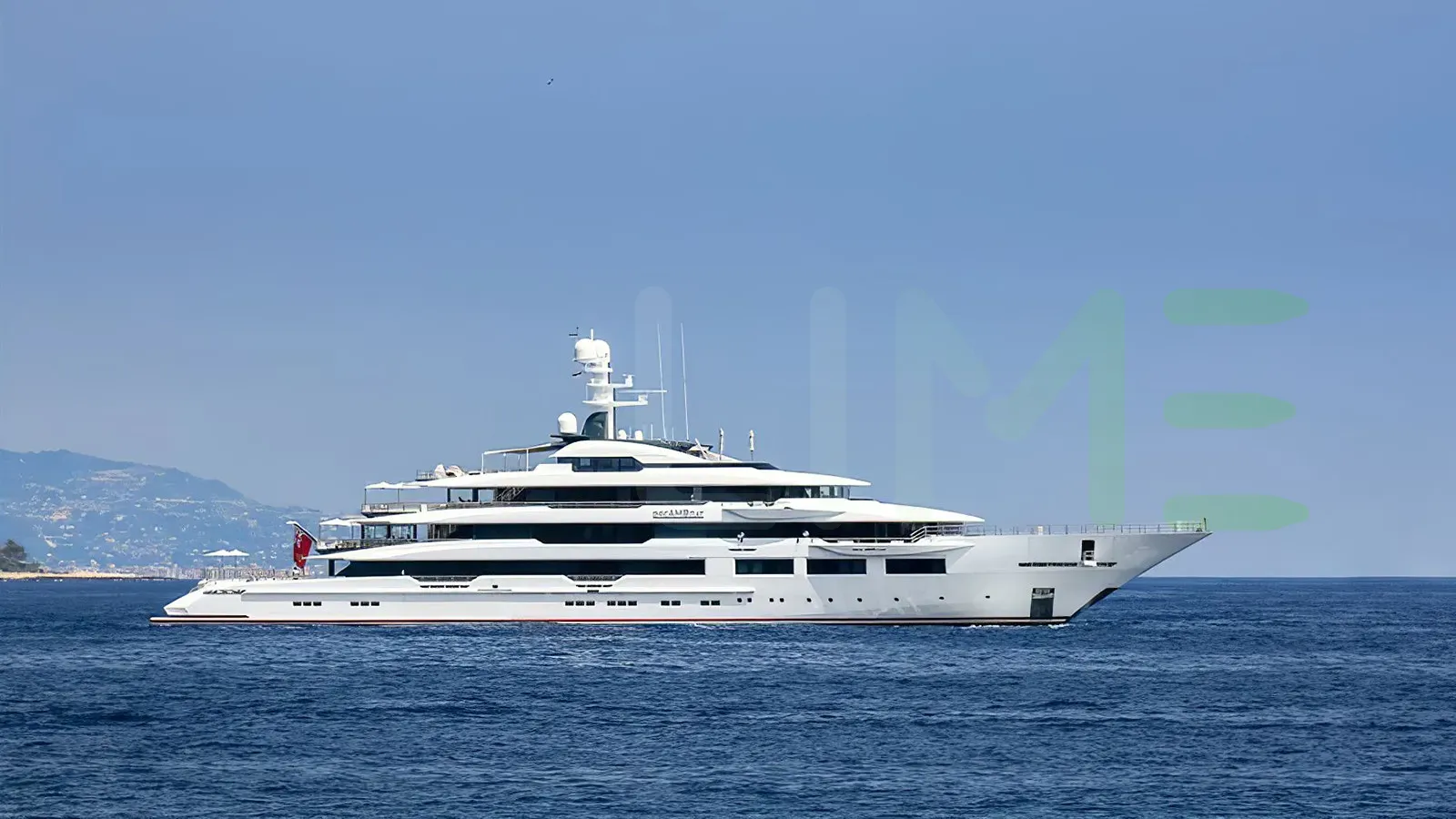 Her features include separate crew passageway, spa, beauty salon, elevator, underwater lights, beach club, gym and air conditioning.