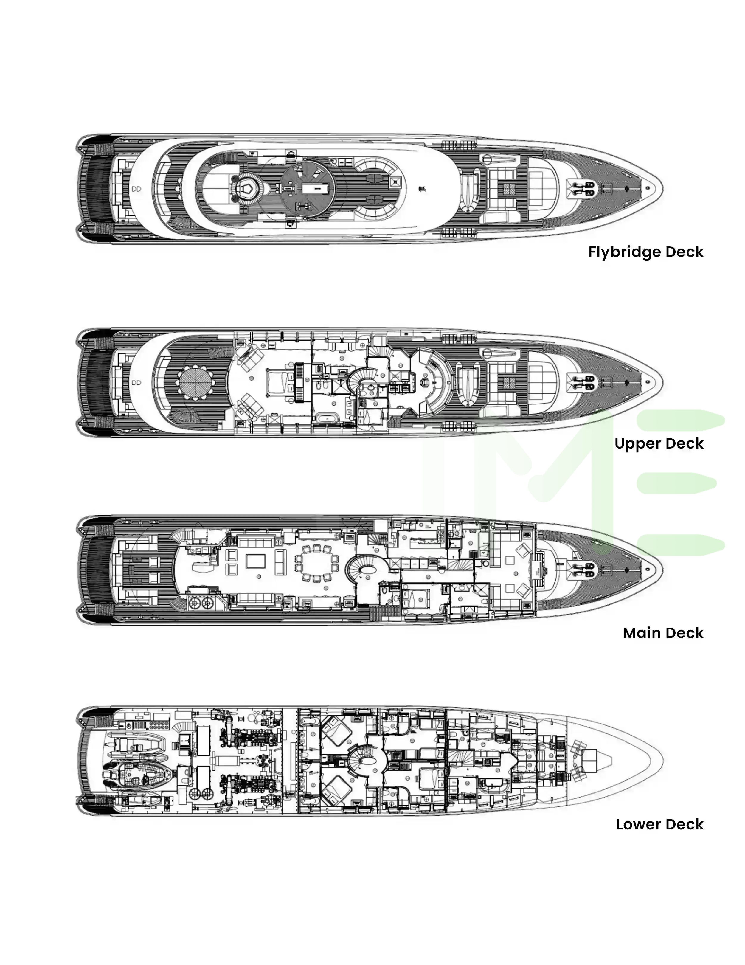 Request plans that include the layout of staterooms, guest areas, and outdoor spaces, as well as crew quarters and work areas.