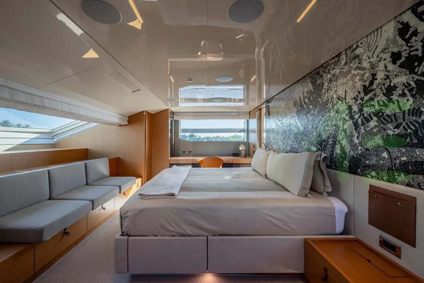 With a gross tonnage of 280, the SOFI VI yacht for charter provides ample interior space for enjoyment. SOFI VI offers accommodations for up to 10 guests . She can also carry up to 6 crew onboard, including the Captain, to ensure a relaxed luxury yacht charter experience. The interior design by Marty Lowe exudes a sense of luxury, seamlessly blending comfort with style.