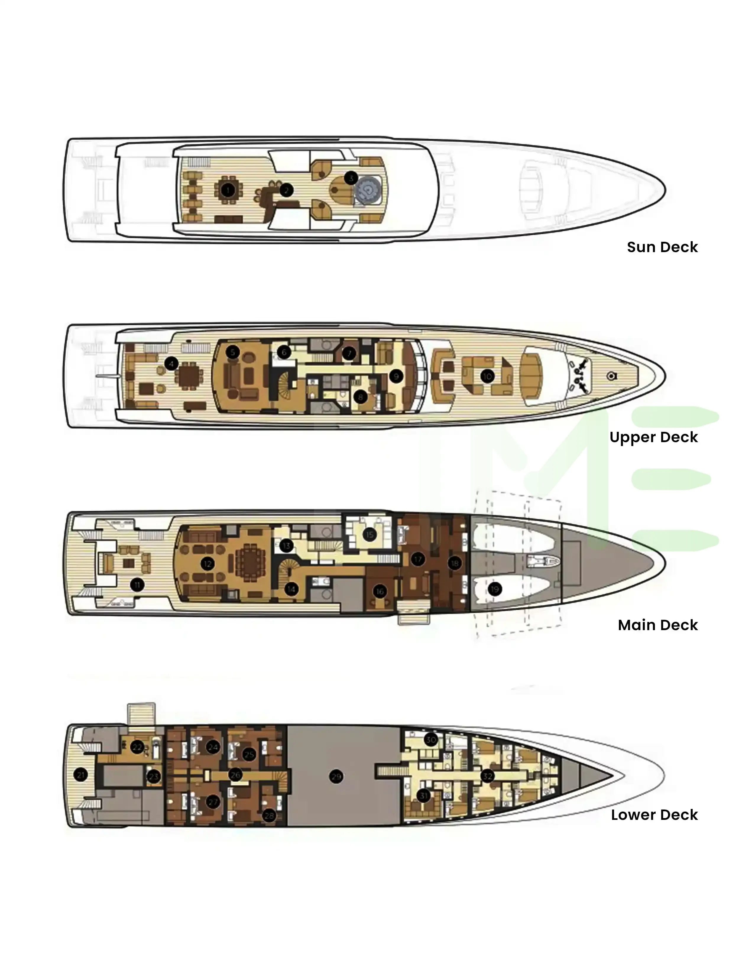 Request plans that include the layout of staterooms, guest areas, and outdoor spaces, as well as crew quarters and work areas.