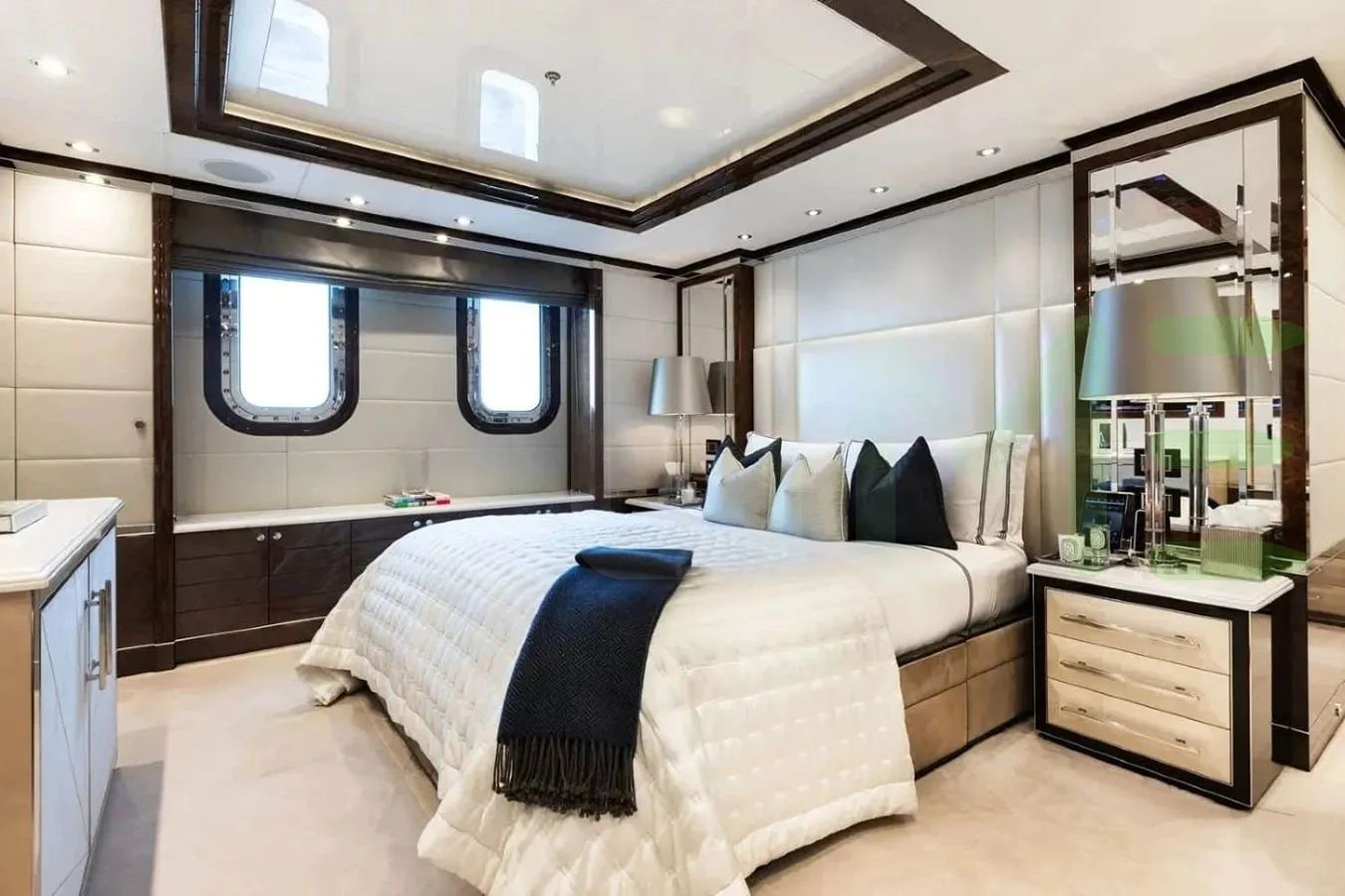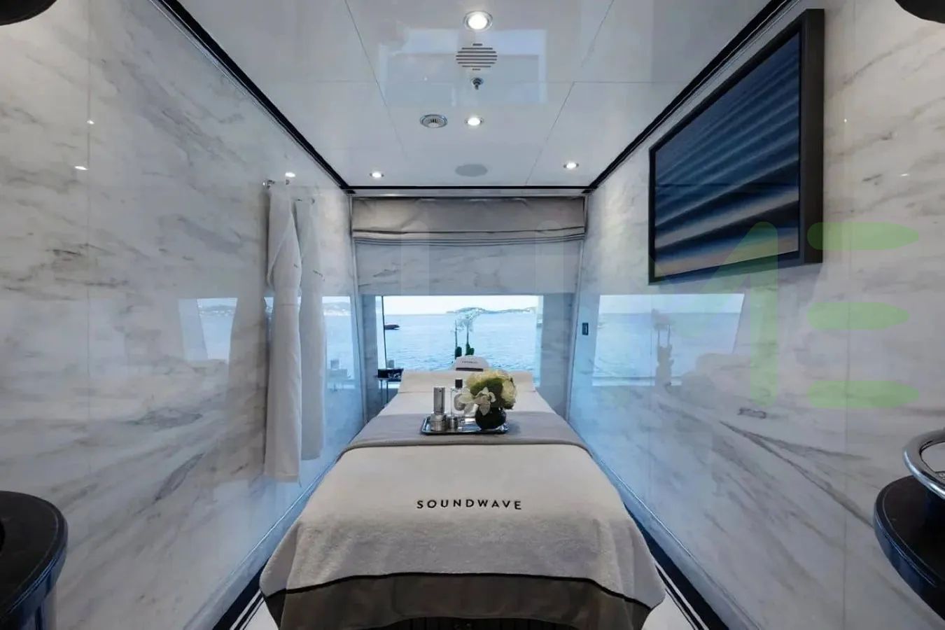 With a gross tonnage of 1,181, the SOUNDWAVE yacht for charter provides ample interior space for enjoyment. SOUNDWAVE offers accommodations for up to 14 guests in 6 lavishly appointed staterooms. She can also carry up to 21 crew onboard, including the Captain, to ensure a relaxed luxury yacht charter experience. The interior design by Candy & Candy exudes a sense of luxury, seamlessly blending comfort with style.