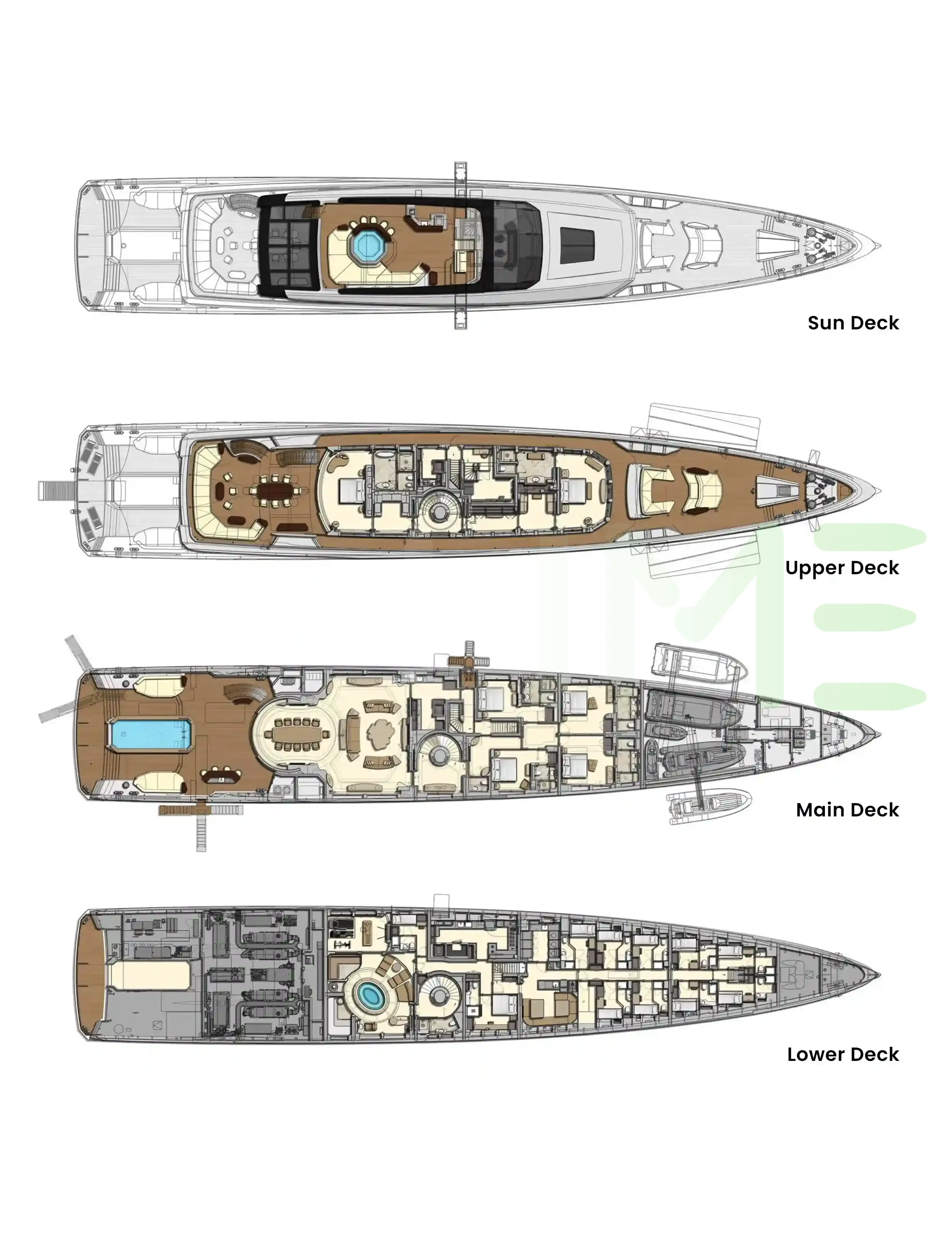 Request plans that include the layout of staterooms, guest areas, and outdoor spaces, as well as crew quarters and work areas.