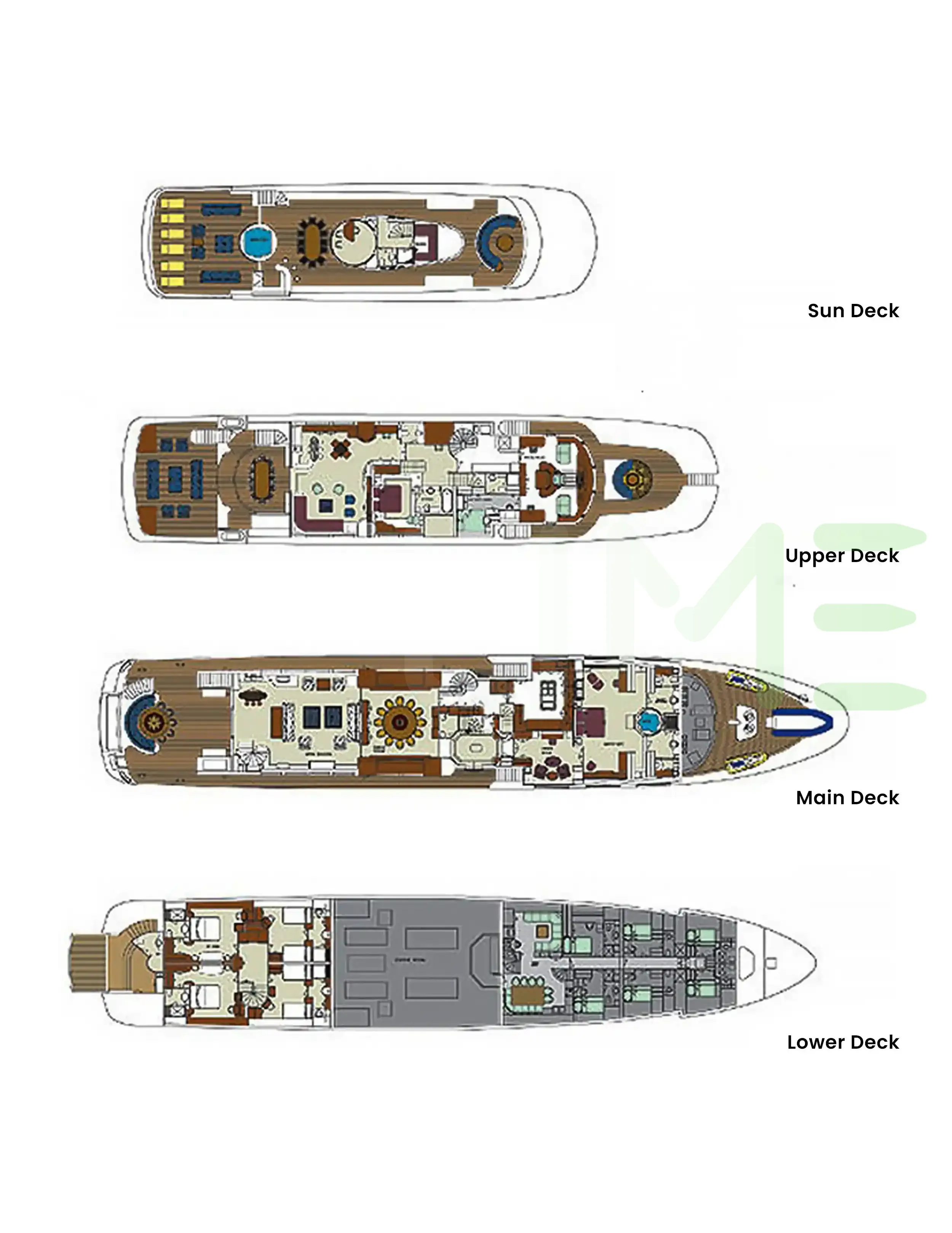 Request plans that include the layout of staterooms, guest areas, and outdoor spaces, as well as crew quarters and work areas.
