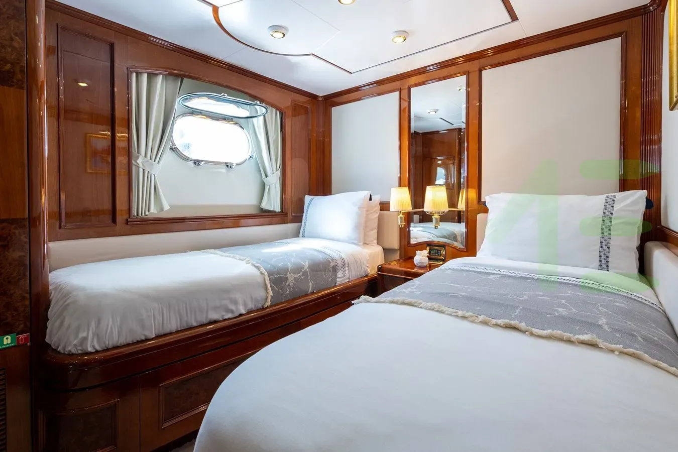 With a gross tonnage of 247, the STELLA FIERA yacht for charter provides ample interior space for enjoyment. STELLA FIERA offers accommodations for up to 8 guests in 5 lavishly appointed staterooms. She can also carry up to 8 crew onboard, including the Captain, to ensure a relaxed luxury yacht charter experience. The interior design by Zuretti Interior Design exudes a sense of luxury, seamlessly blending comfort with style.