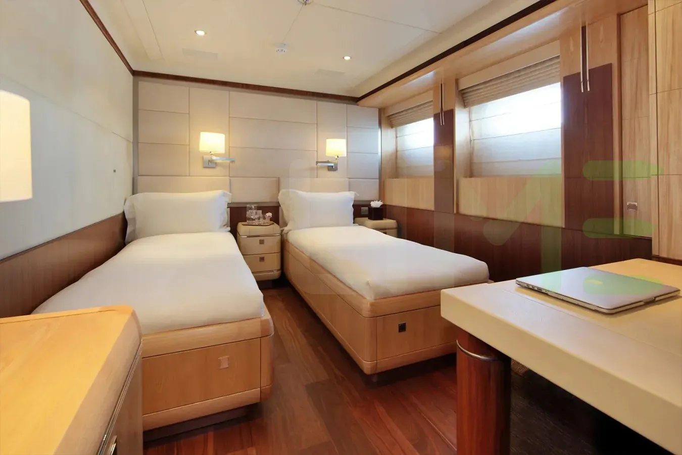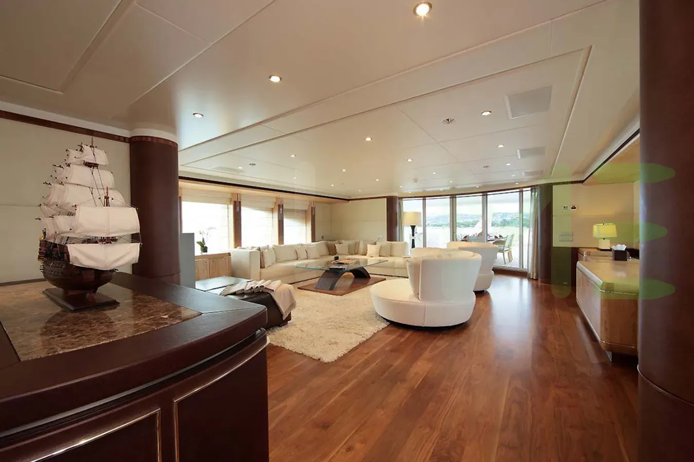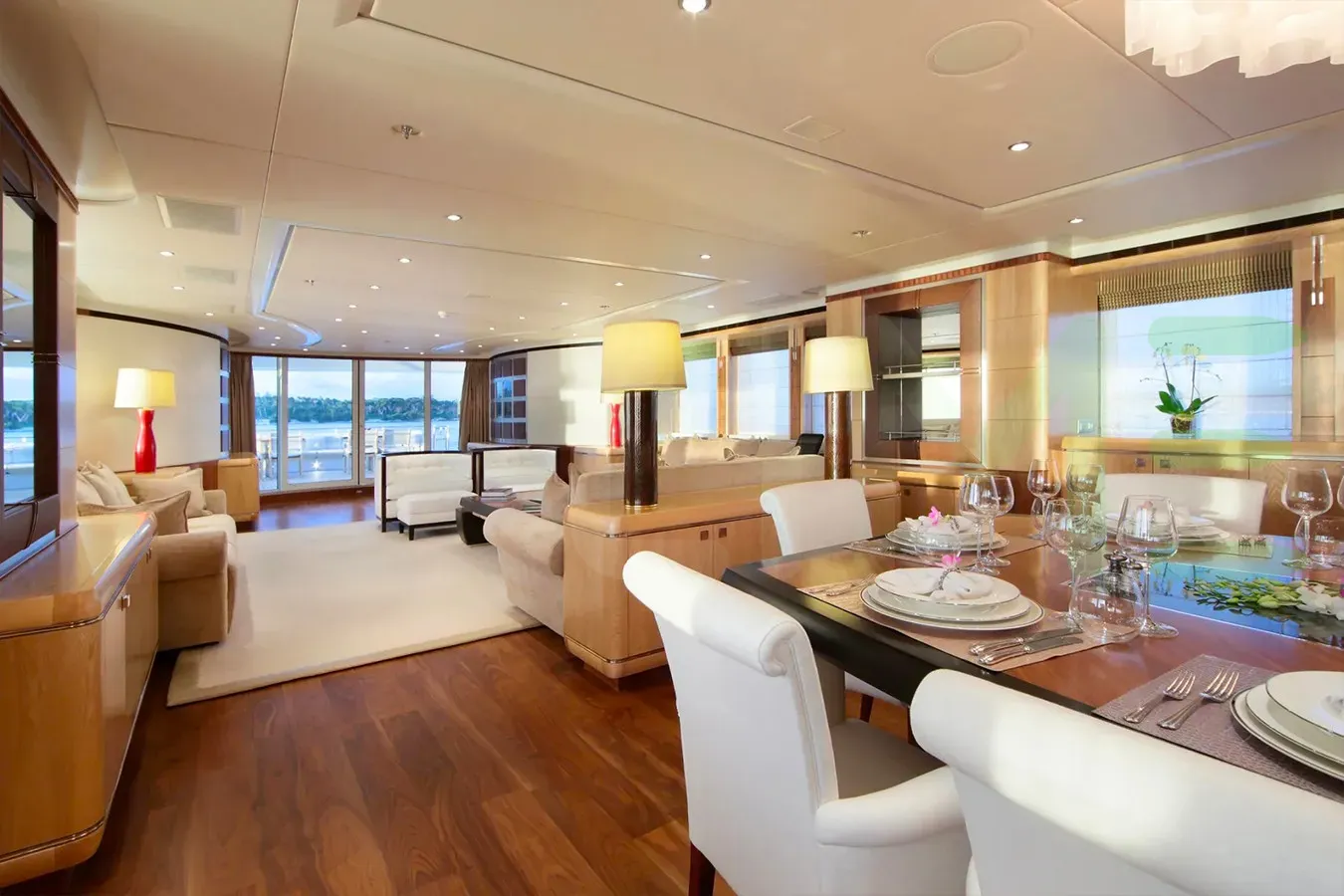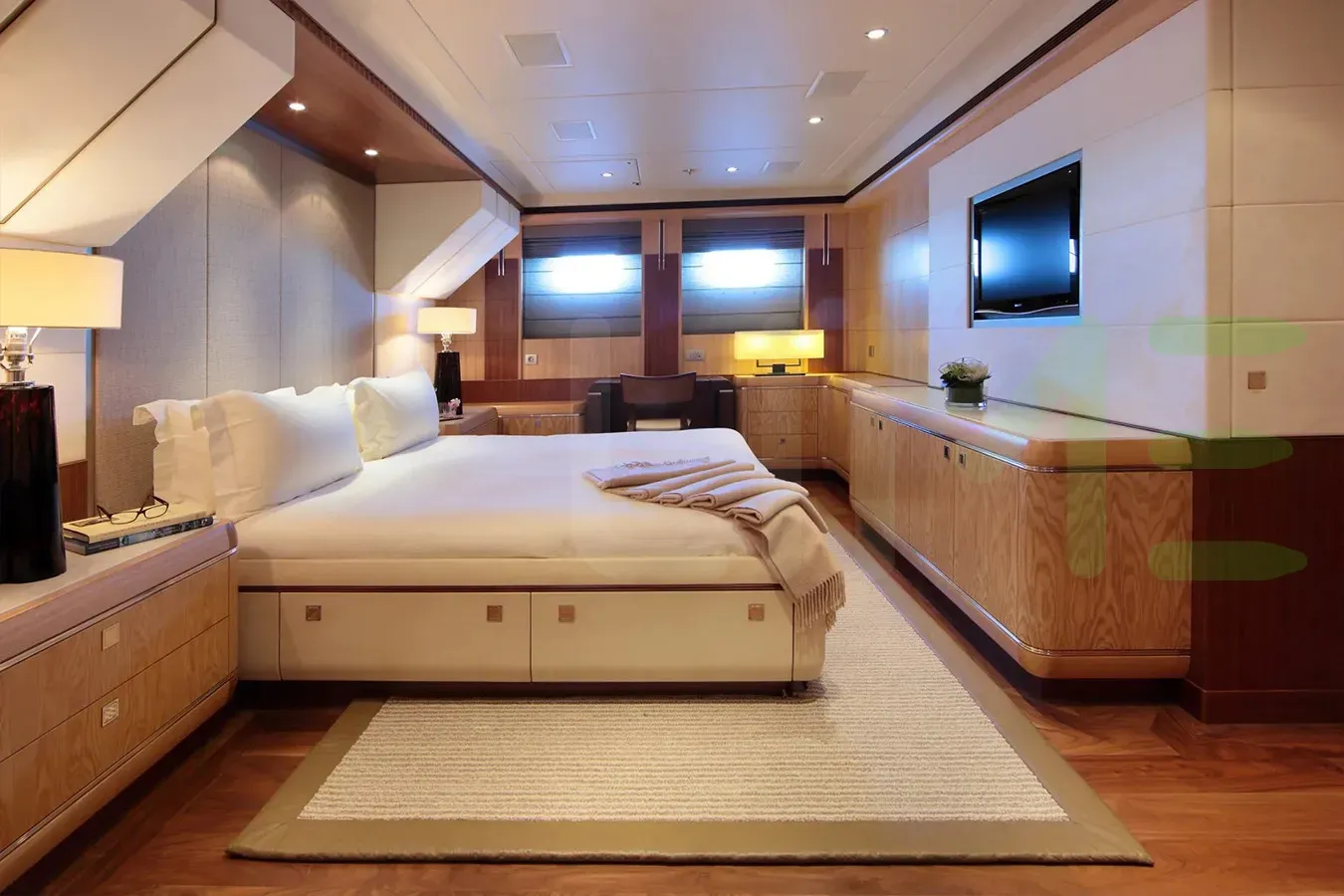 With a gross tonnage of 499, the STORMBORN yacht for charter provides ample interior space for enjoyment. STORMBORN offers accommodations for up to 10 guests in 5 lavishly appointed staterooms. She can also carry up to 9 crew onboard, including the Captain, to ensure a relaxed luxury yacht charter experience. The interior design by Heesen Yachts, Omega Architects exudes a sense of luxury, seamlessly blending comfort with style.