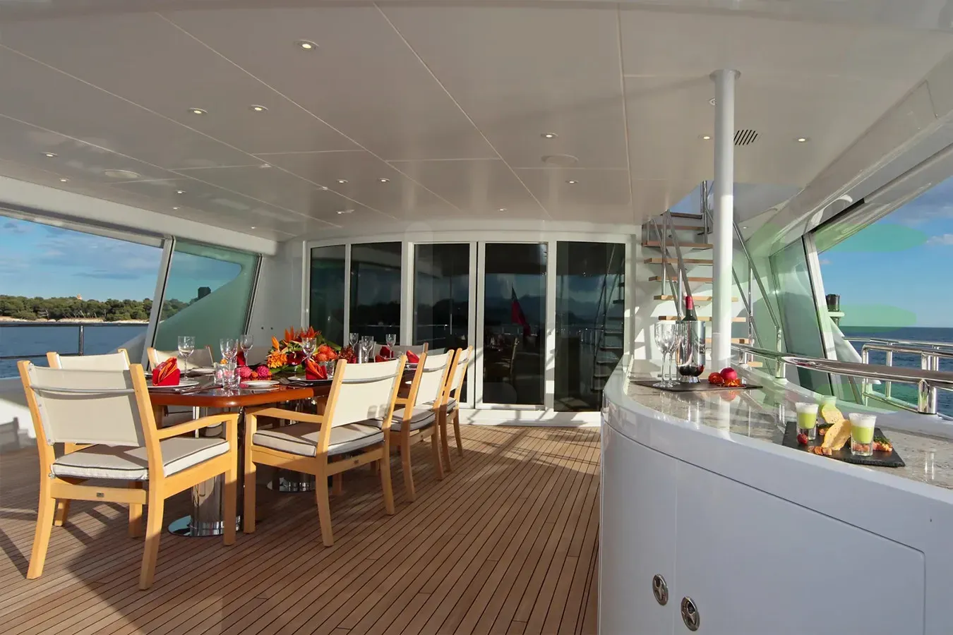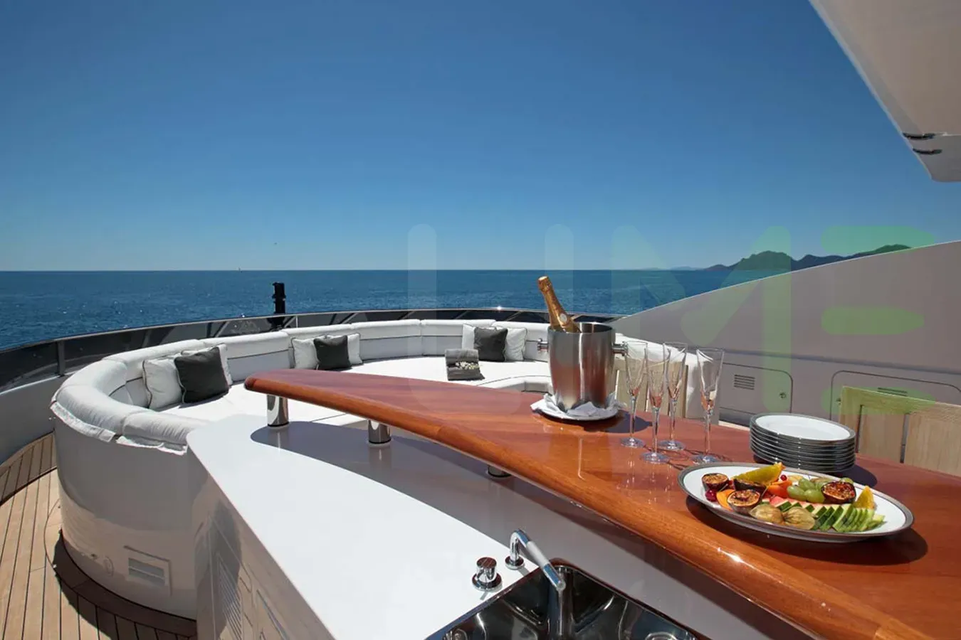 The exterior, designed by Heesen Yachts, Omega Architects, captures your attention with beautiful lines and impeccable craftsmanship. Whether you're lounging on the spacious decks or enjoying water sports in a secluded anchorage, the STORMBORN yacht for charter, built of Steel and Aluminium, offers a wealth of opportunities for relaxation and adventure.