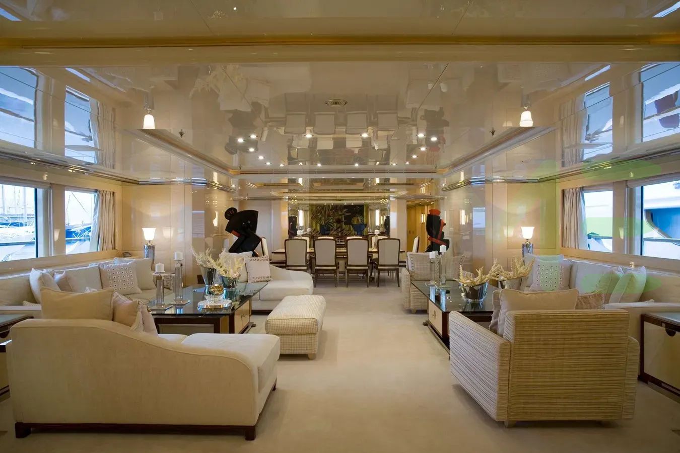 With a gross tonnage of 748, the SUNDAY yacht for charter provides ample interior space for enjoyment. SUNDAY offers accommodations for up to 12 guests in 6 lavishly appointed staterooms. She can also carry up to 15 crew onboard, including the Captain, to ensure a relaxed luxury yacht charter experience. The interior design by Studio Ipso exudes a sense of luxury, seamlessly blending comfort with style.