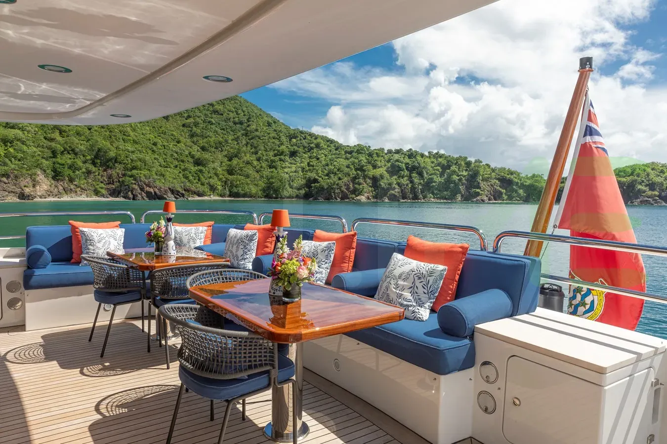 The exterior, designed by Stefano Righini Design, captures your attention with beautiful lines and impeccable craftsmanship. Whether you're lounging on the spacious decks or enjoying water sports in a secluded anchorage, the SUR LA MER yacht for charter, built of GRP, offers a wealth of opportunities for relaxation and adventure.