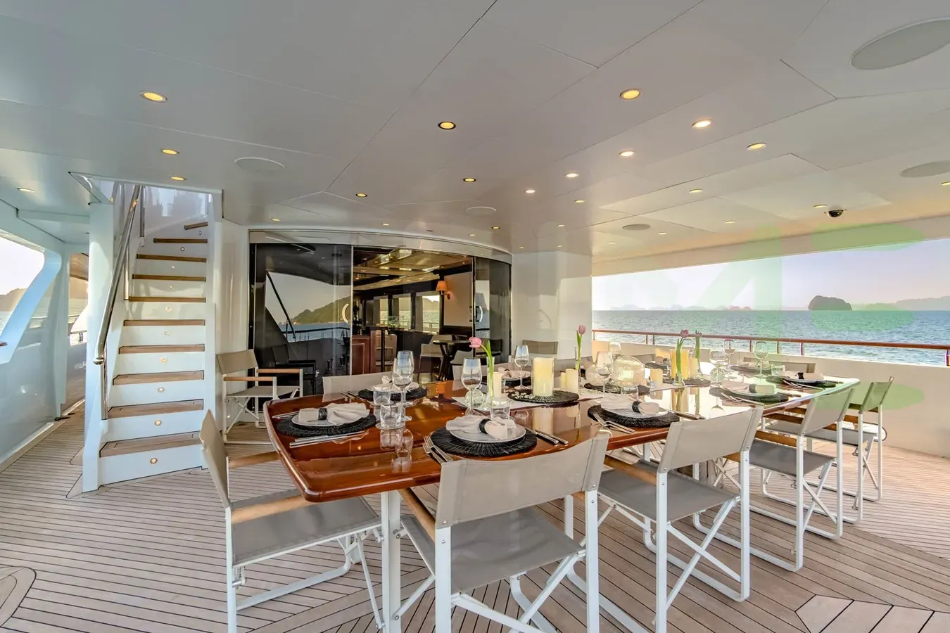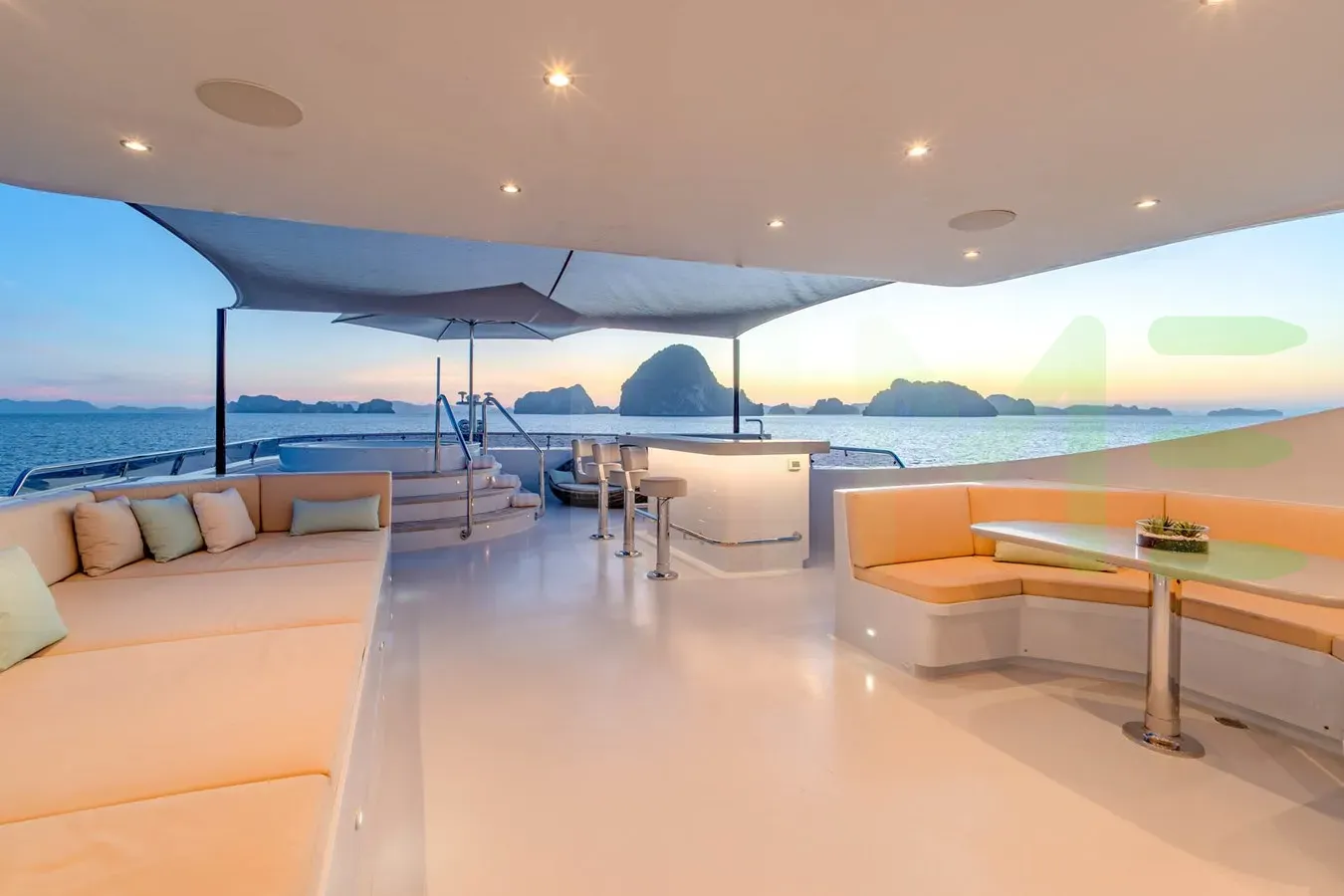 Her features include underwater lights, gym, deck jacuzzi, WiFi and air conditioning.