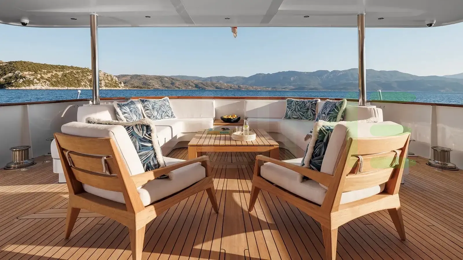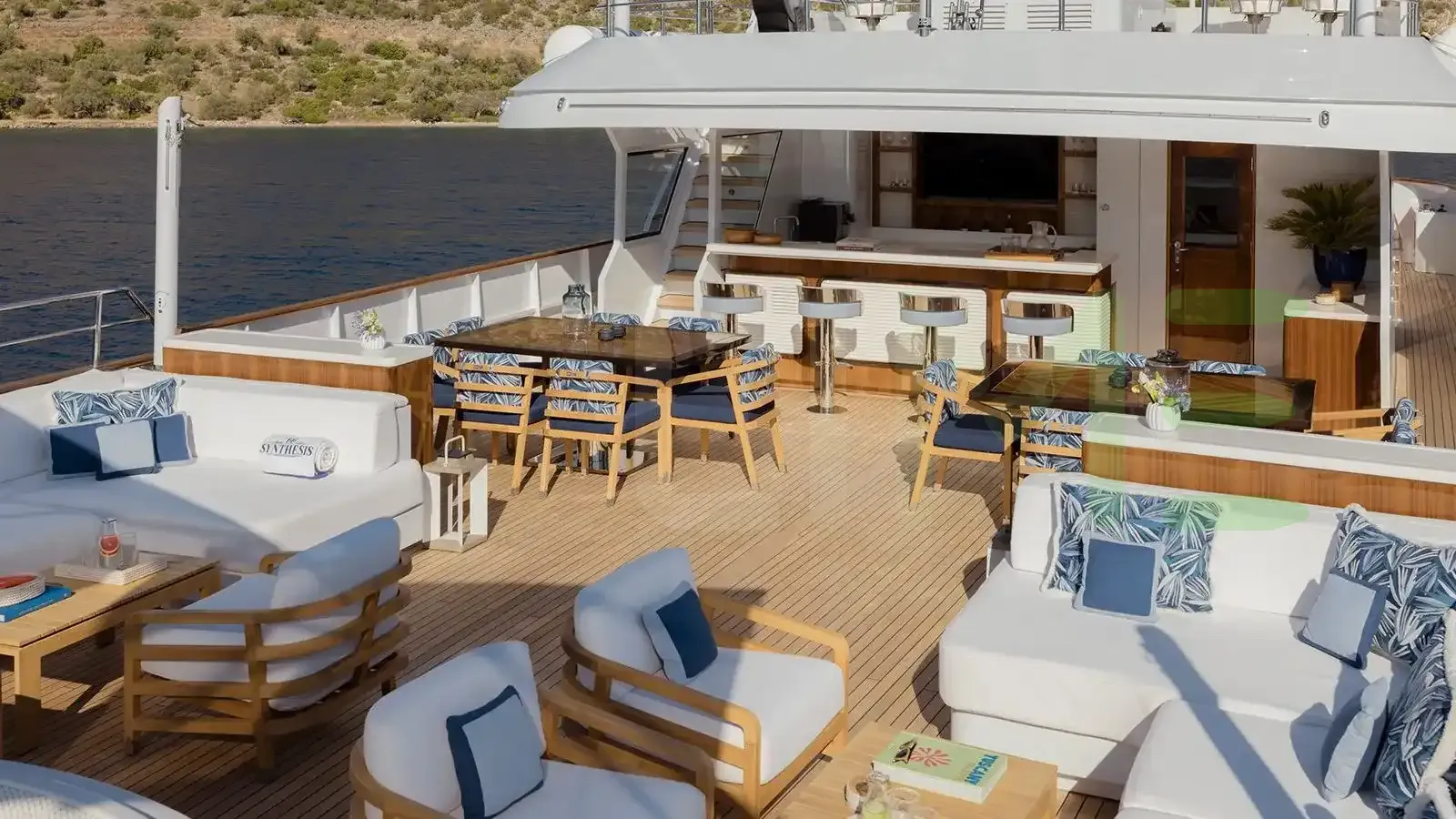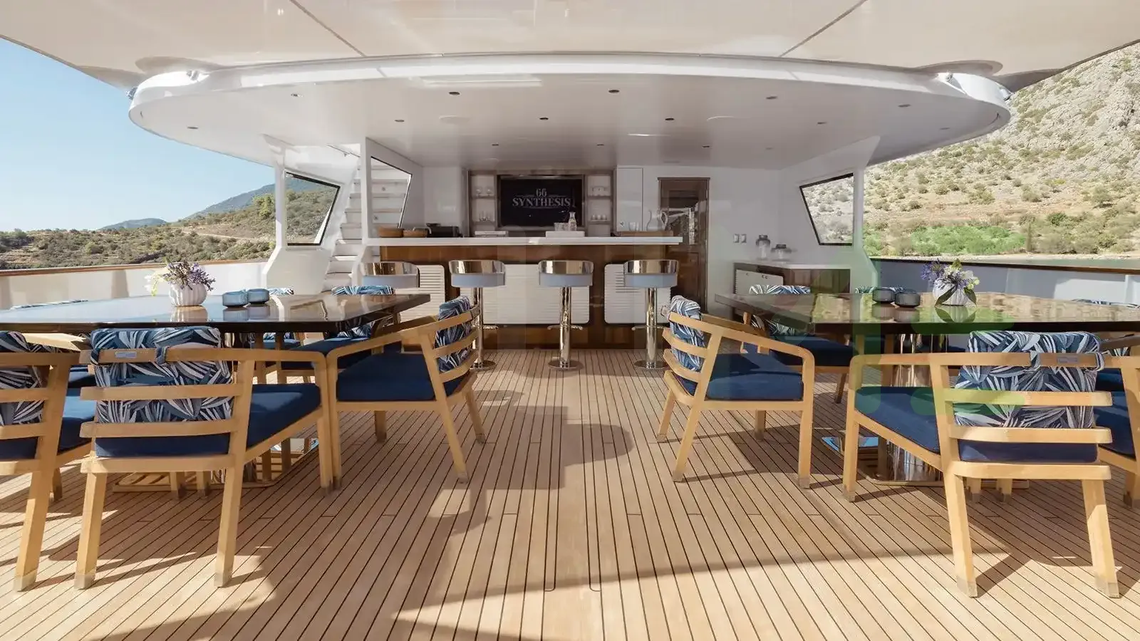 The exterior, designed by De Voogt Naval Architects, captures your attention with beautiful lines and impeccable craftsmanship. Whether you're lounging on the spacious decks or enjoying water sports in a secluded anchorage, the SYNTHESIS 66 yacht for charter, built of Steel and Aluminium, offers a wealth of opportunities for relaxation and adventure.
