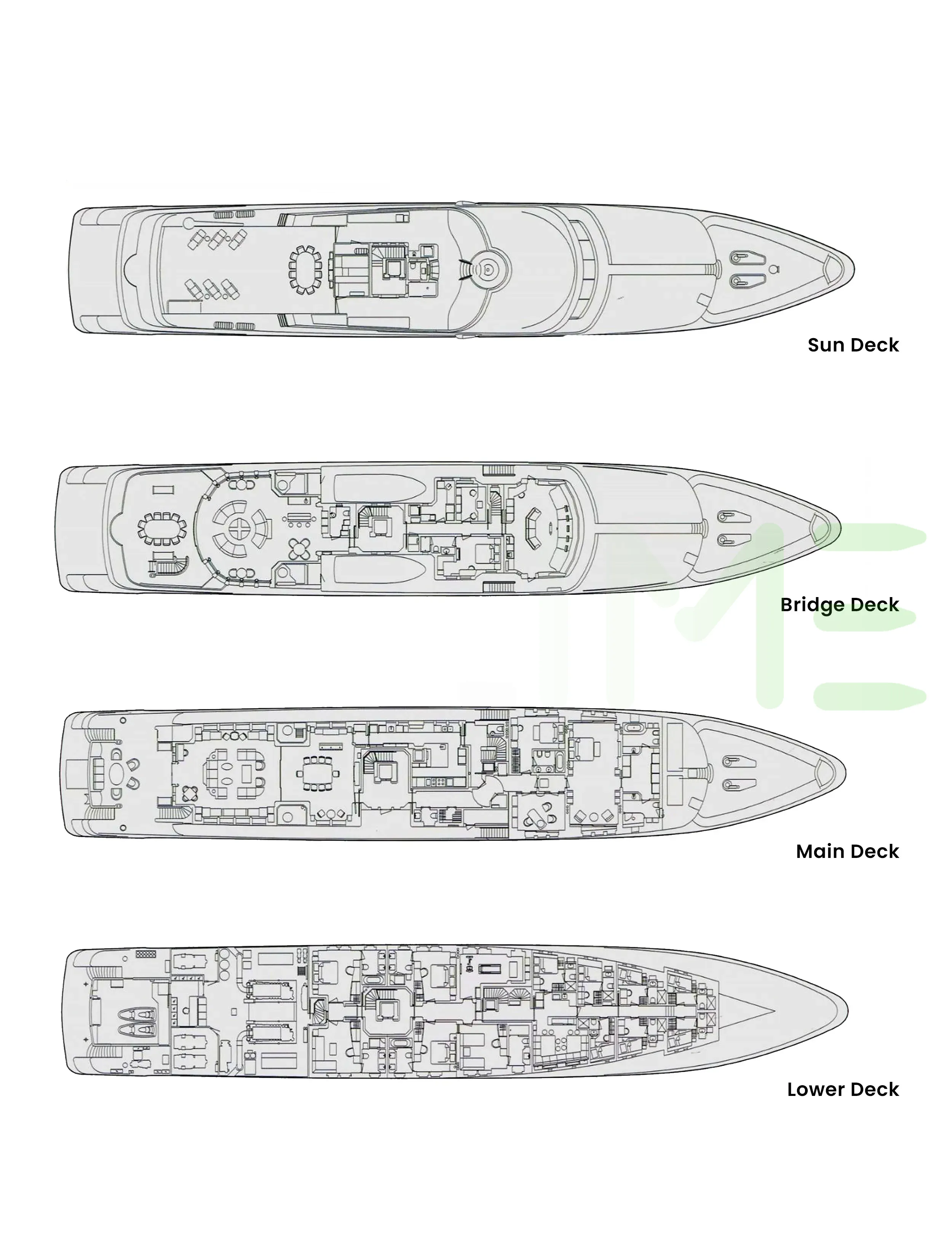 Request plans that include the layout of staterooms, guest areas, and outdoor spaces, as well as crew quarters and work areas.