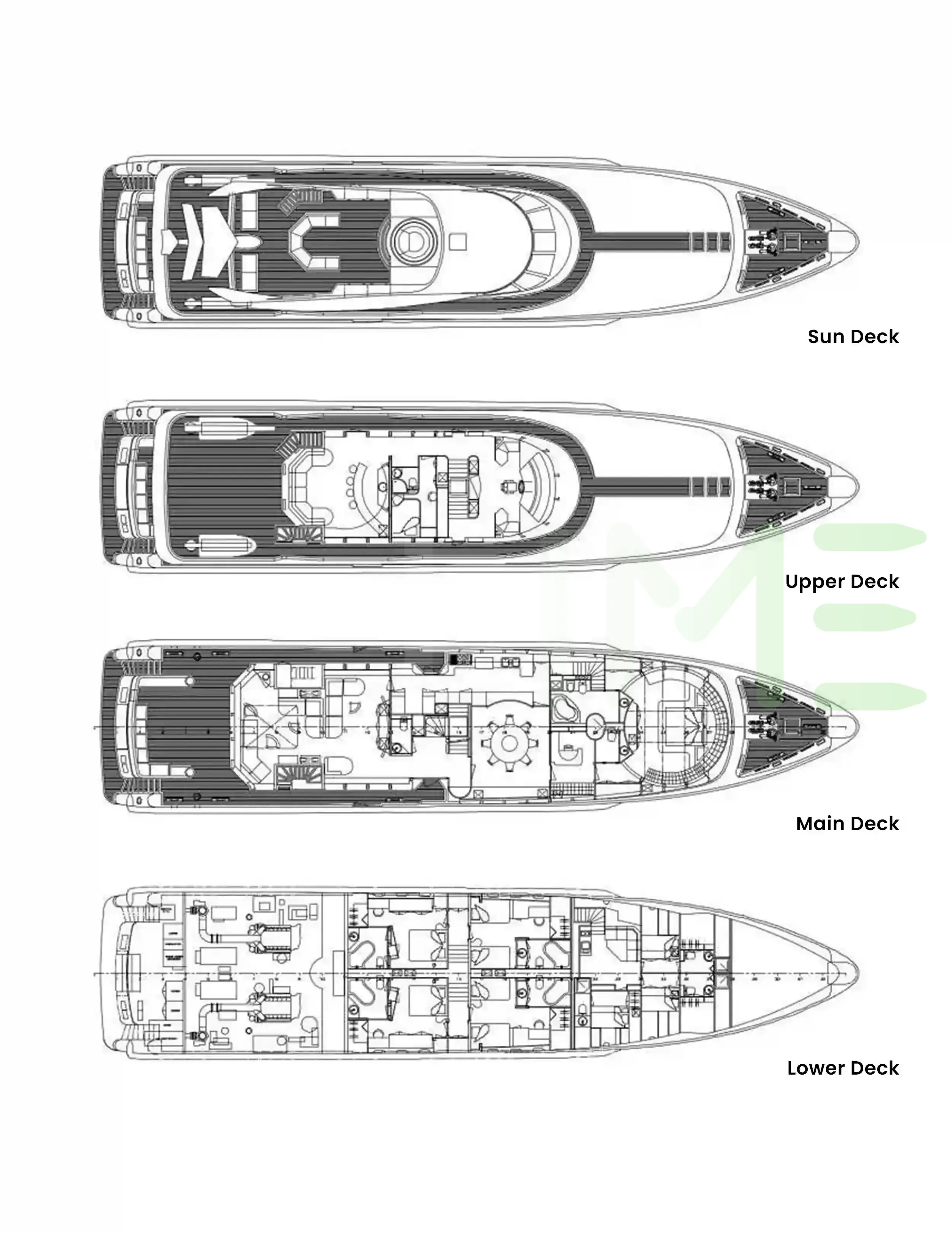 Request plans that include the layout of staterooms, guest areas, and outdoor spaces, as well as crew quarters and work areas.