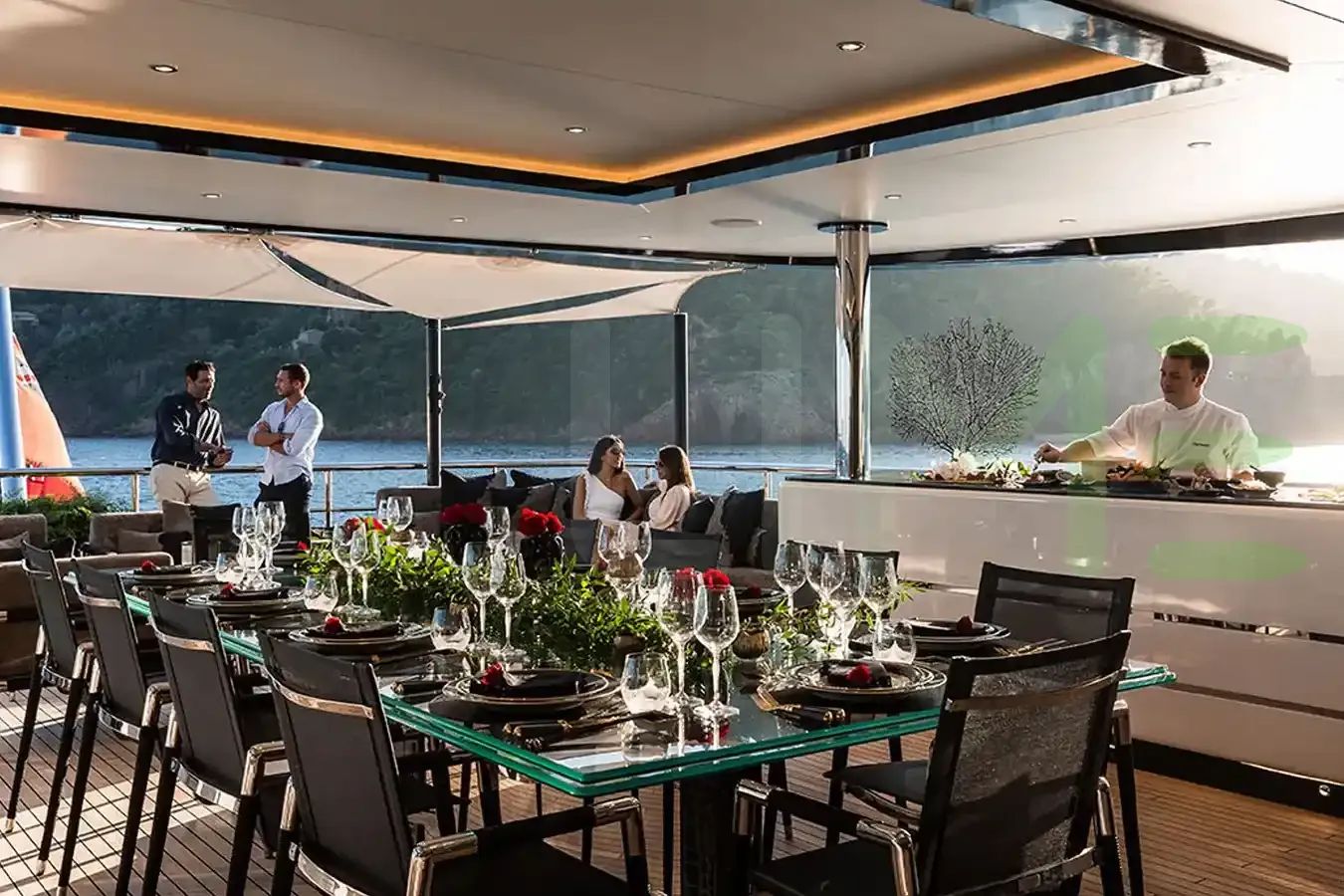 A charter on Triumph is comfortable and convenient thanks to the provided amenities, notably a sauna to help you detox and regenerate. Head to the beach club and take advantage of indoor-outdoor living and entertaining and in addition you can visit the well-equipped gym so that you can keep up with your fitness routine at sea. Sit back with a glass of champagne in the deck jacuzzi.