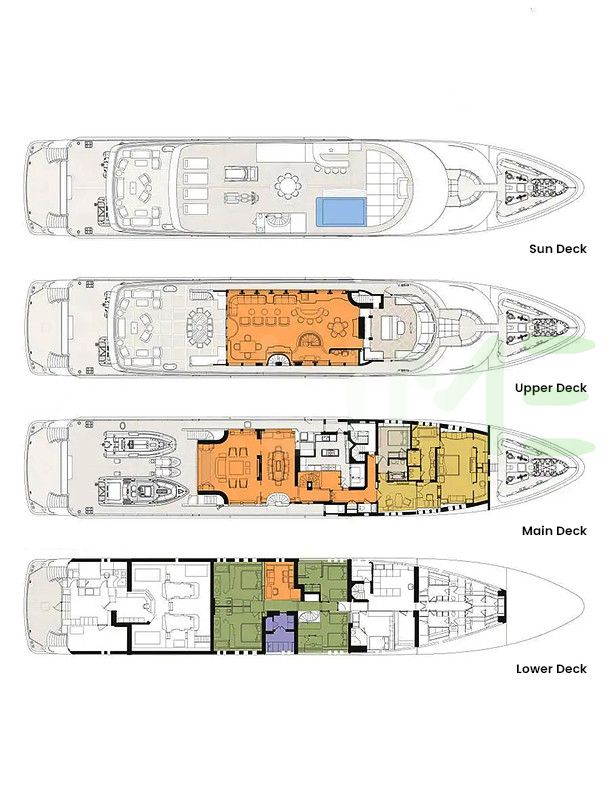 Request plans that include the layout of staterooms, guest areas, and outdoor spaces, as well as crew quarters and work areas.