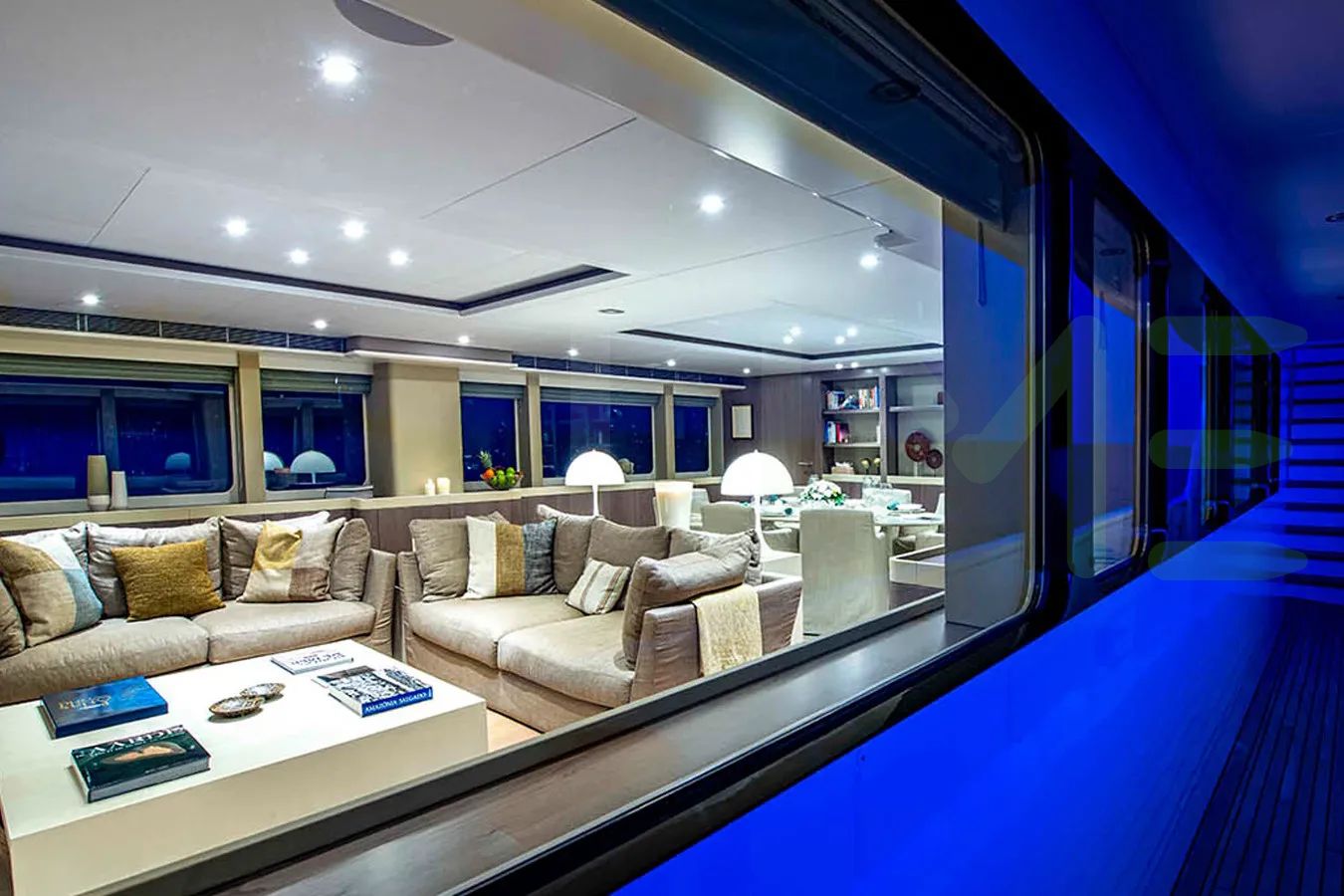With a gross tonnage of 377, the UNEXPECTED yacht for charter provides ample interior space for enjoyment. UNEXPECTED offers accommodations for up to 8 guests in 5 lavishly appointed staterooms. She can also carry up to 7 crew onboard, including the Captain, to ensure a relaxed luxury yacht charter experience. The interior design by Omega Architects exudes a sense of luxury, seamlessly blending comfort with style.