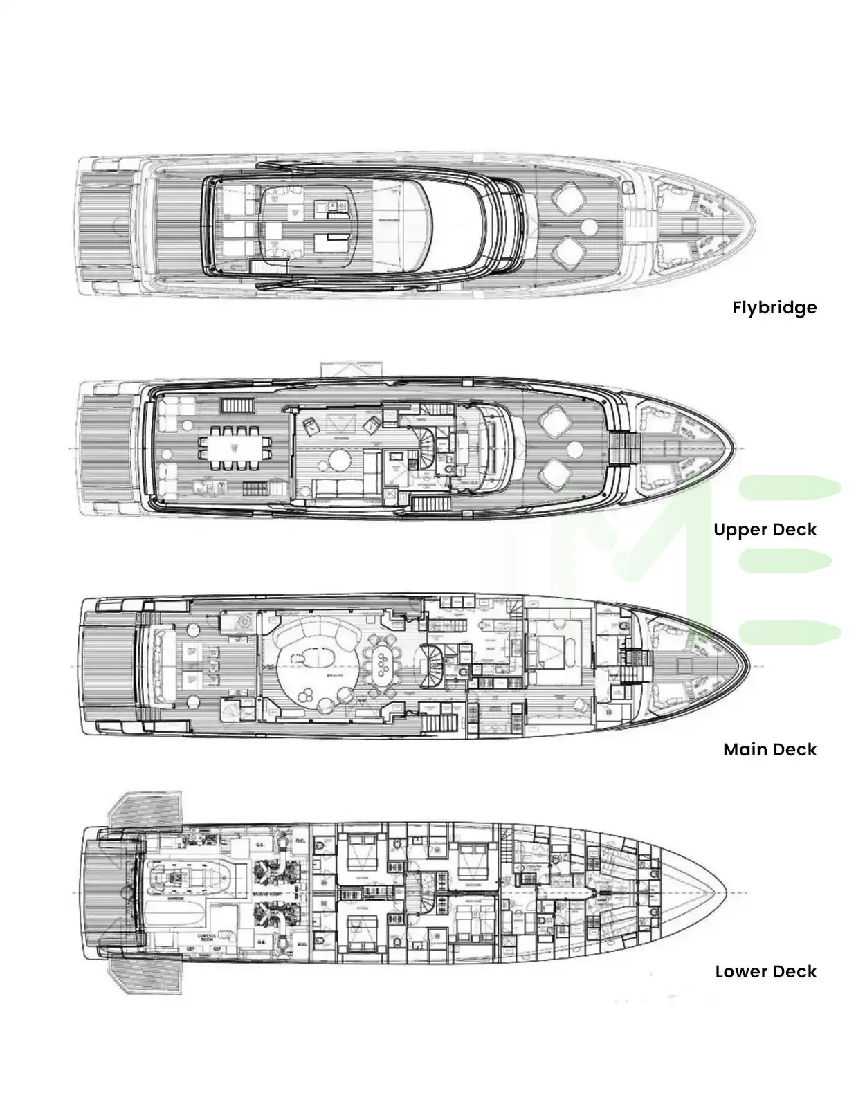 Request plans that include the layout of staterooms, guest areas, and outdoor spaces, as well as crew quarters and work areas.