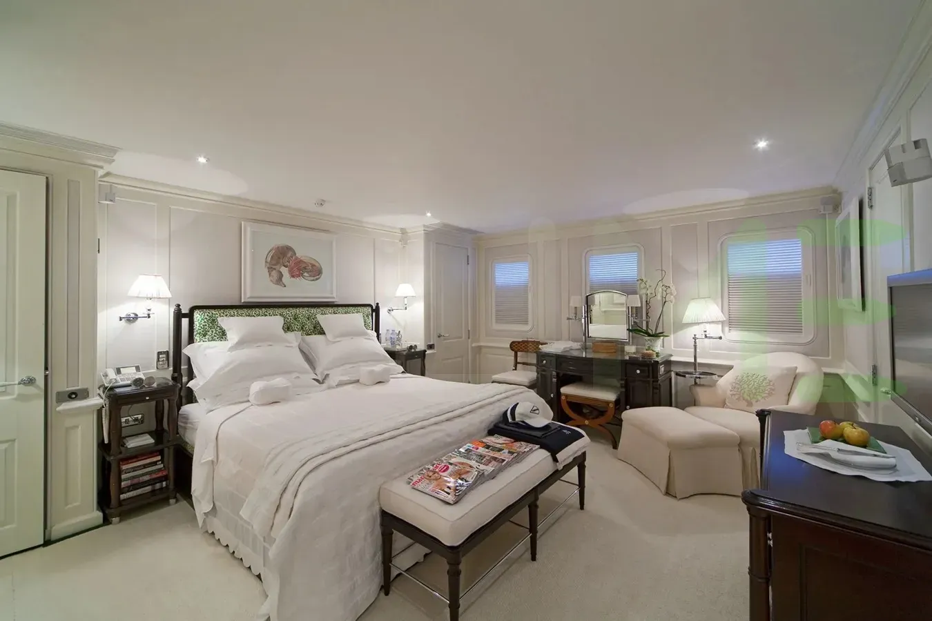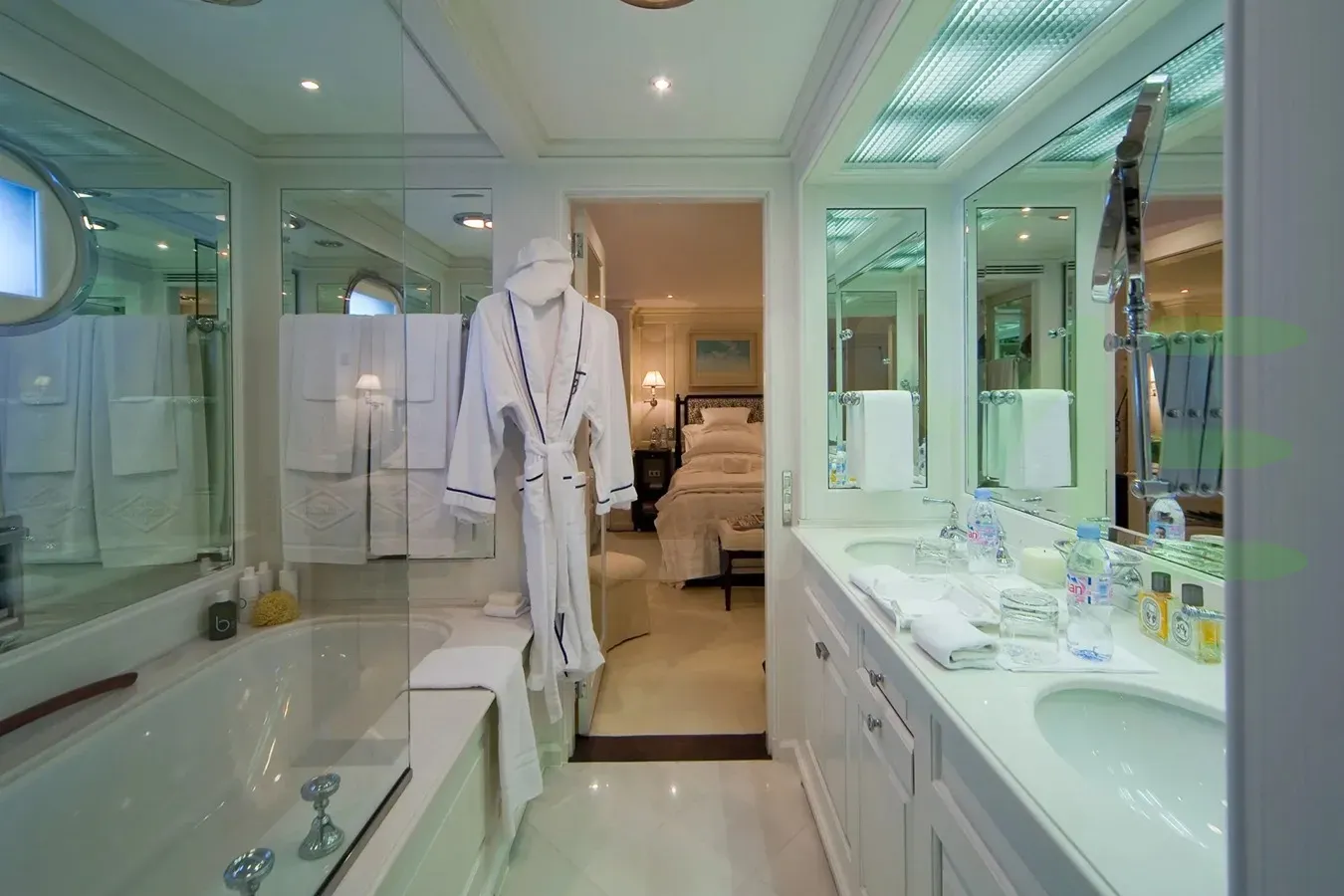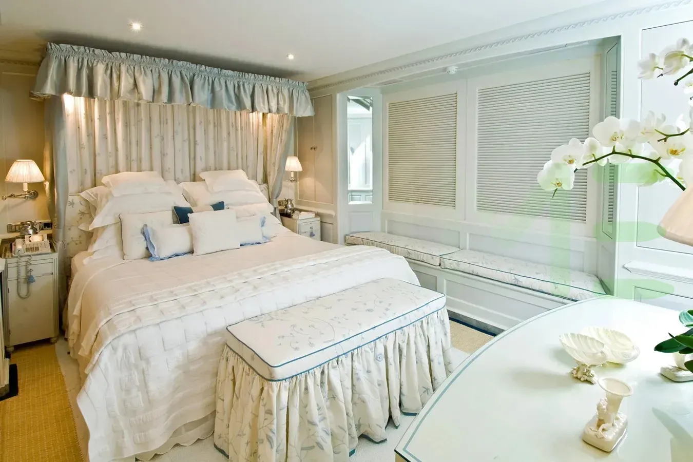 With a gross tonnage of 1,027, the VIRGINIAN yacht for charter provides ample interior space for enjoyment. VIRGINIAN offers accommodations for up to 12 guests in 6 lavishly appointed staterooms. She can also carry up to 18 crew onboard, including the Captain, to ensure a relaxed luxury yacht charter experience. The interior design by David Easton exudes a sense of luxury, seamlessly blending comfort with style.