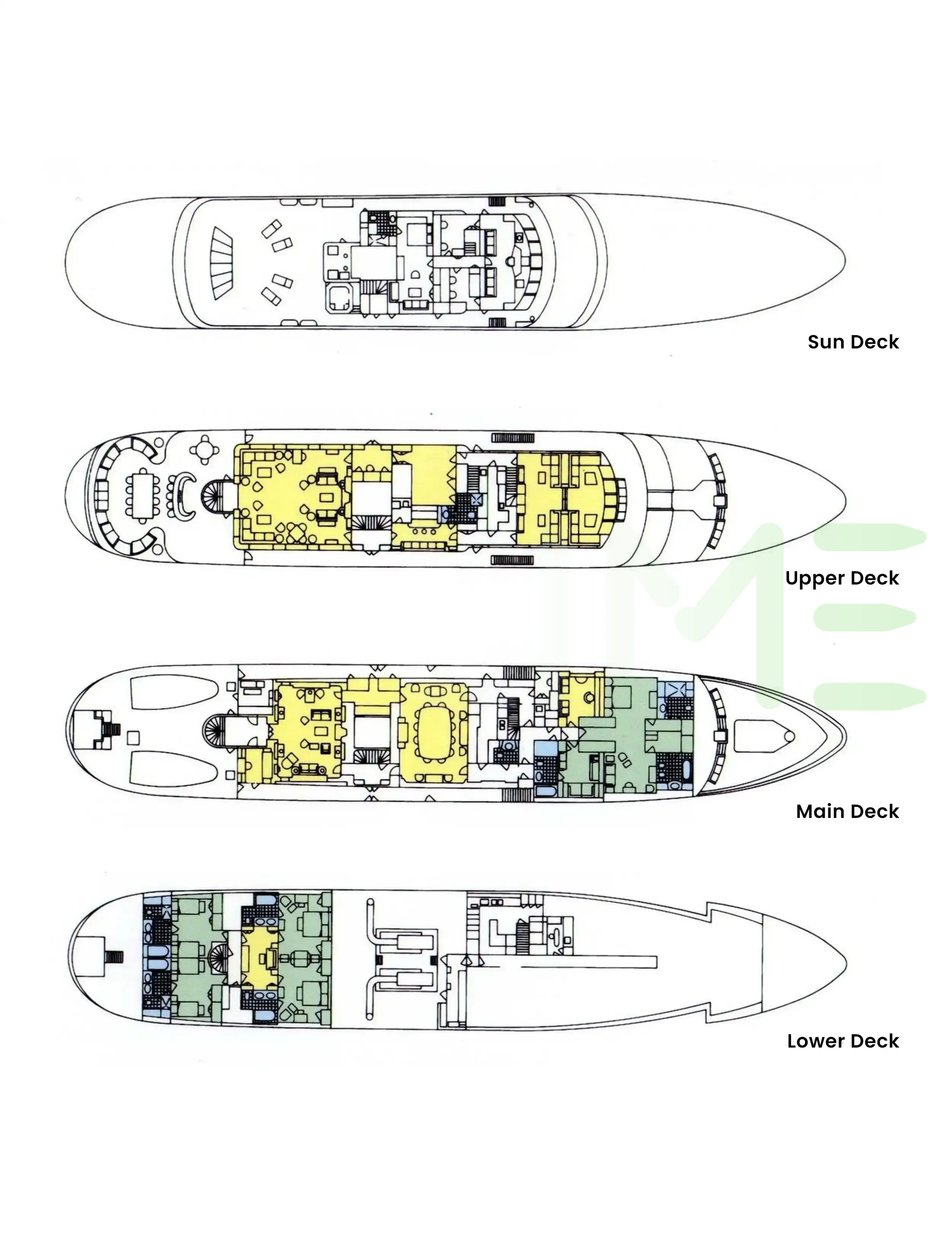 Request plans that include the layout of staterooms, guest areas, and outdoor spaces, as well as crew quarters and work areas.