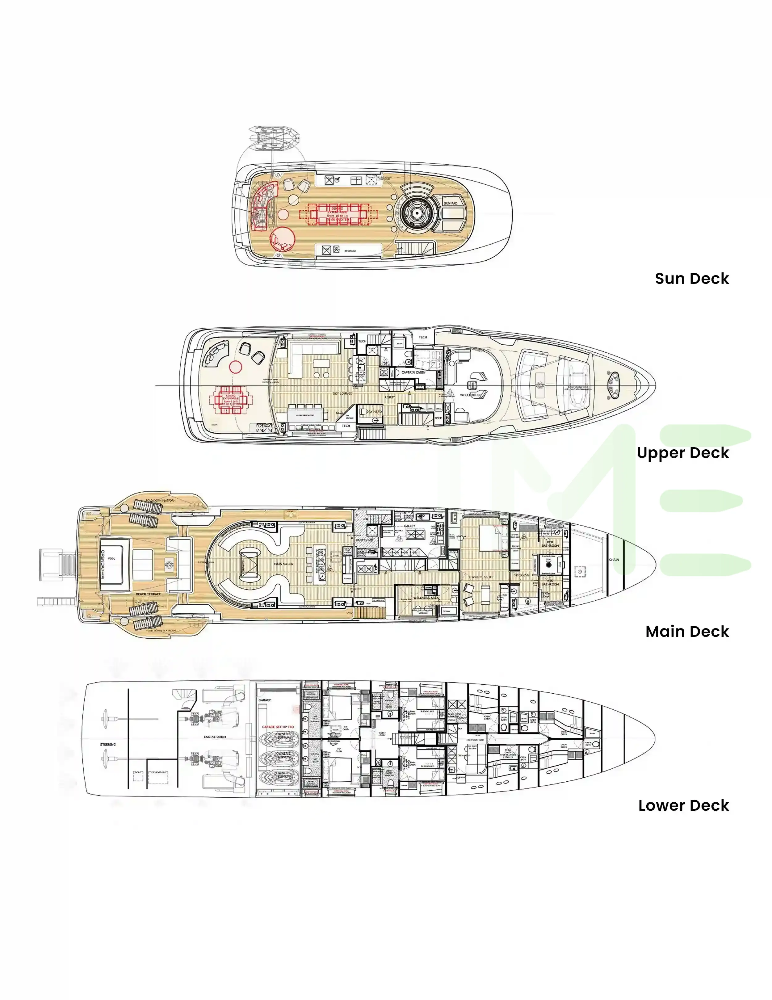 Request plans that include the layout of staterooms, guest areas, and outdoor spaces, as well as crew quarters and work areas.