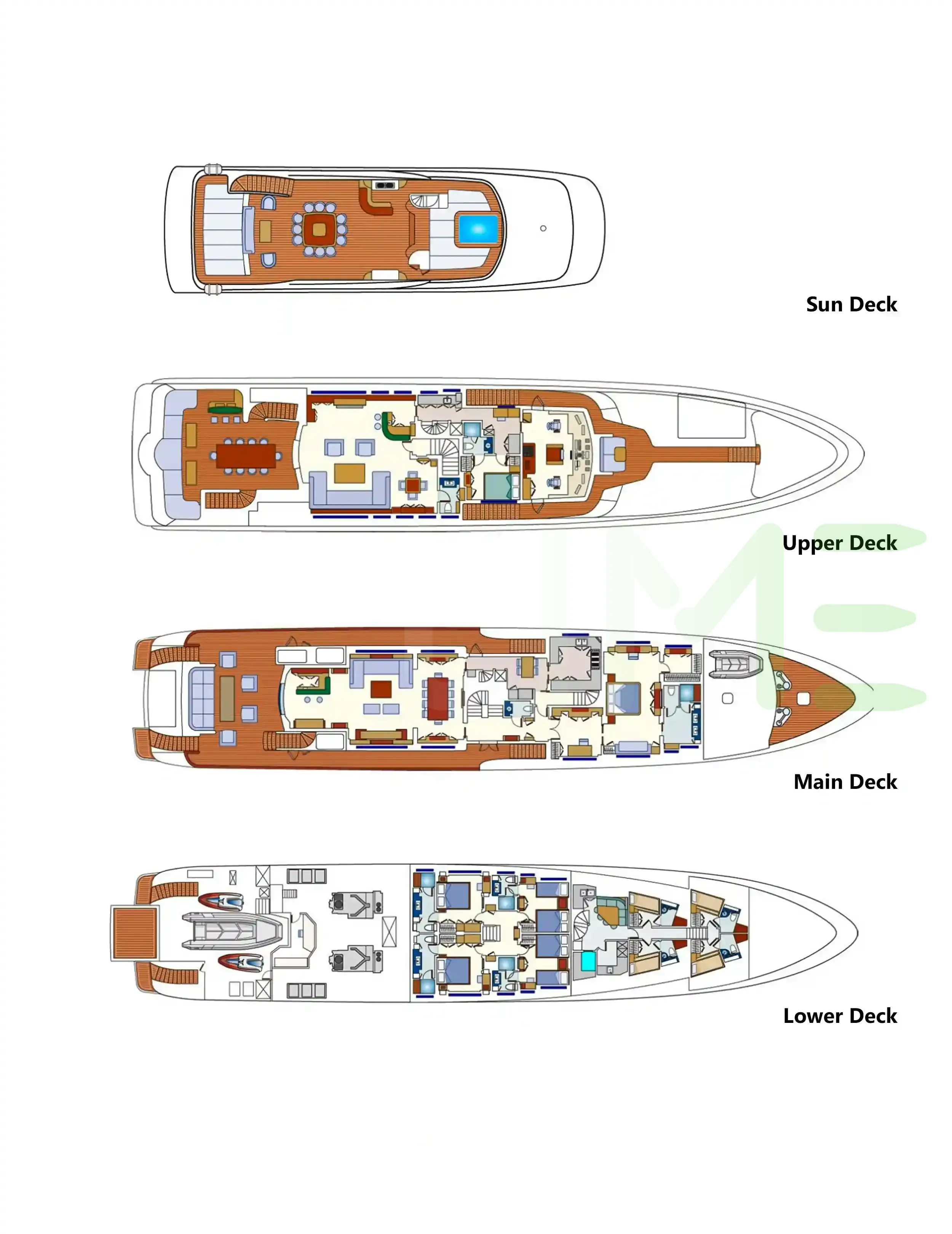 Request plans that include the layout of staterooms, guest areas, and outdoor spaces, as well as crew quarters and work areas.