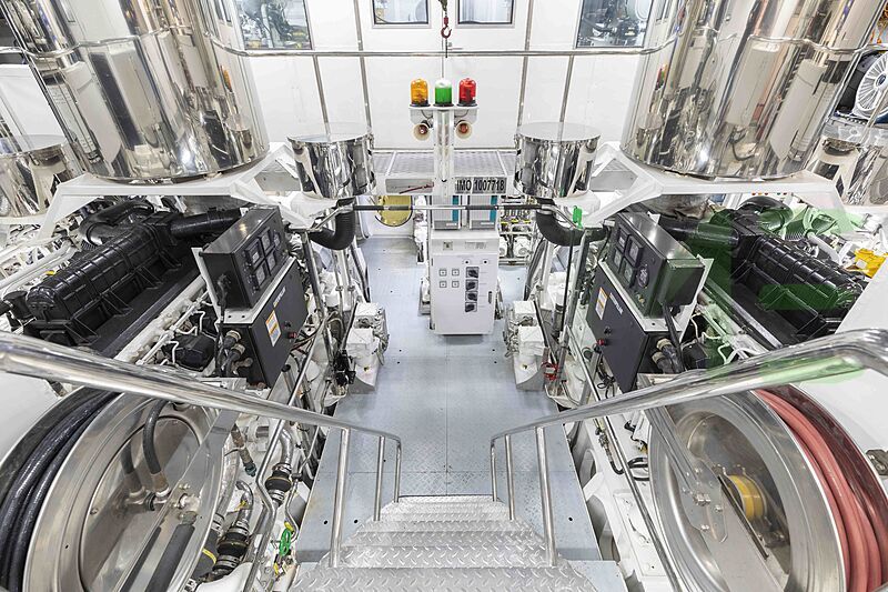 Powered by two Caterpillar main engines, each generating 1,499 horsepower, for a total combined output of 2,998 horsepower. Notably, the 4 ROSES yacht is one of 2,673 yachts greater than 65’(19m) with Caterpillar engines.