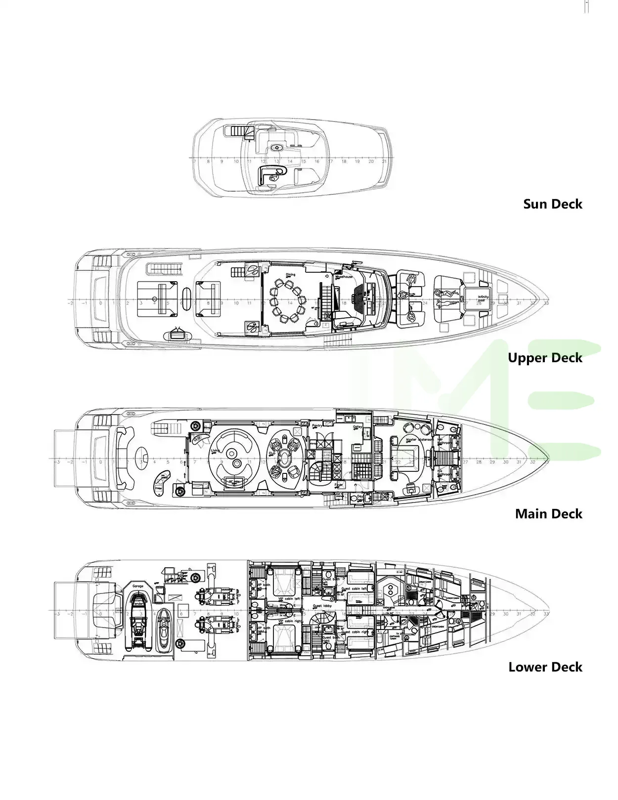 Request plans that include the layout of staterooms, guest areas, and outdoor spaces, as well as crew quarters and work areas.