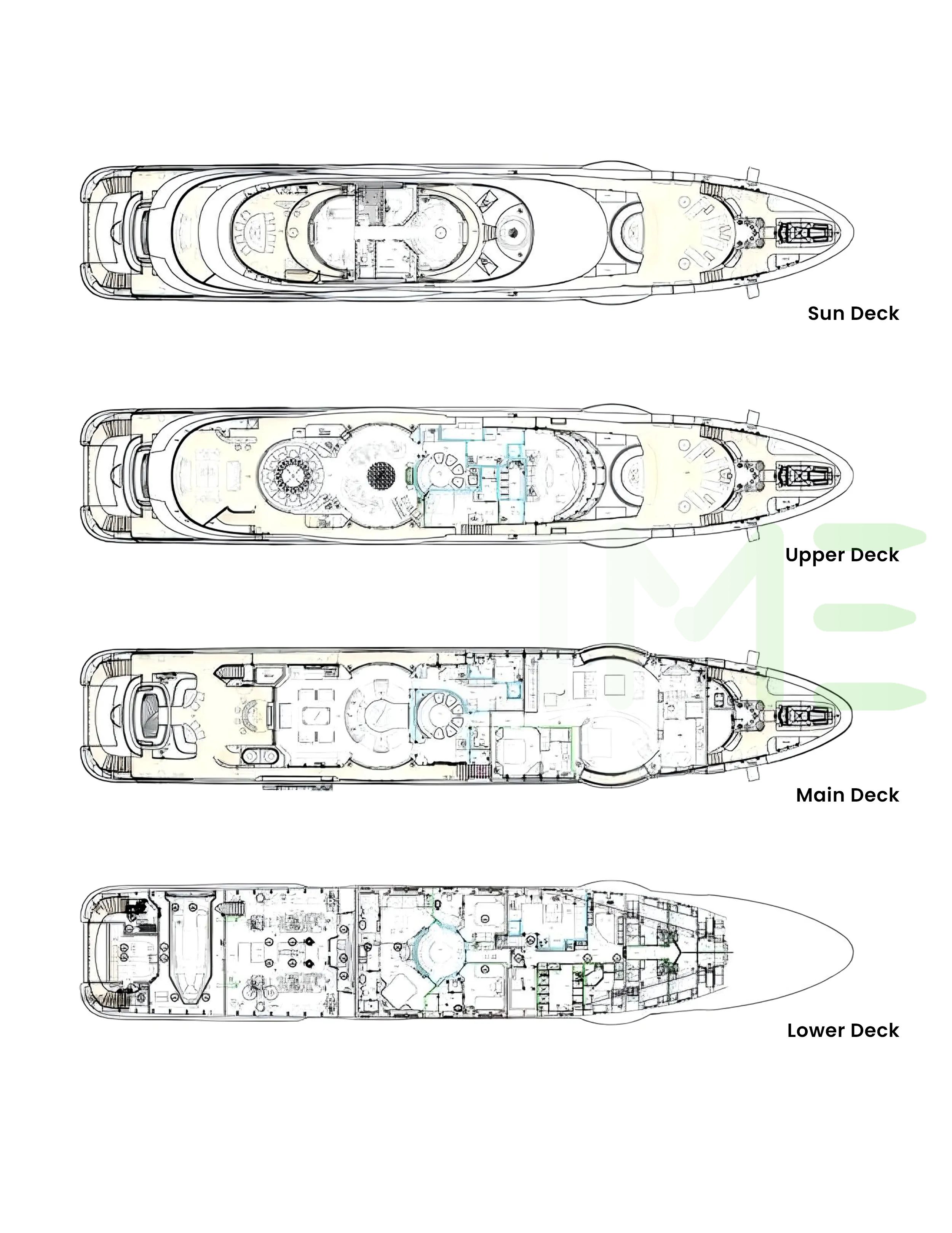 Request plans that include the layout of staterooms, guest areas, and outdoor spaces, as well as crew quarters and work areas.