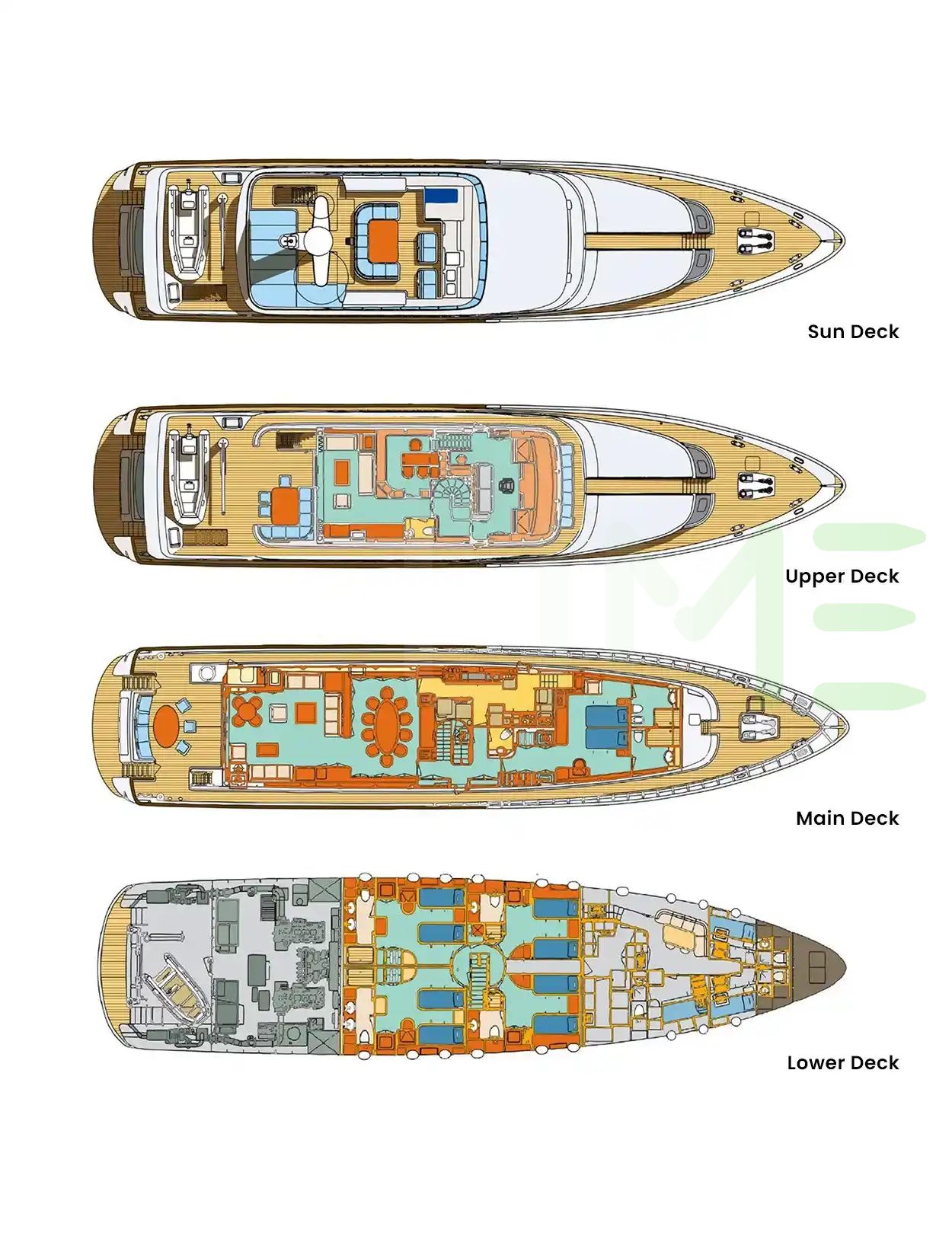 Request plans that include the layout of staterooms, guest areas, and outdoor spaces, as well as crew quarters and work areas.