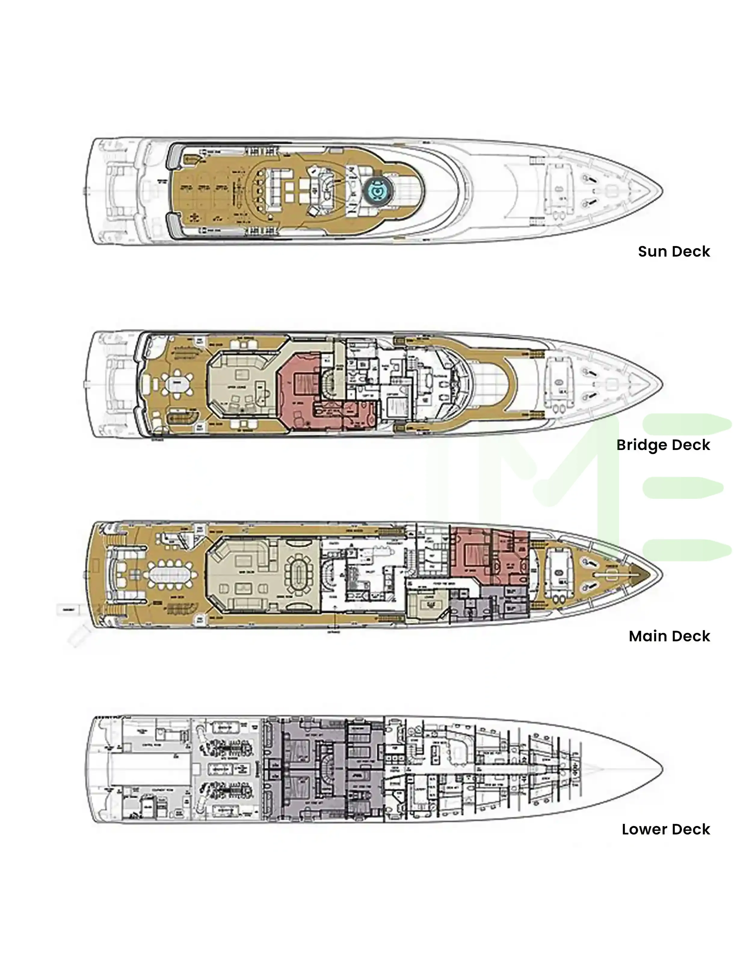 Request plans that include the layout of staterooms, guest areas, and outdoor spaces, as well as crew quarters and work areas.